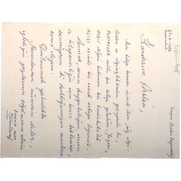 Parti işleri ne âlemde? Meşgul oluyor musun? Zamanı pek yaklaştı. Senin için candan temennilerim var. Ben evde kaldığım günler durmadan yeni romanımı yazıyorum. Sanki eskisi ortaya çıkmış gibi. Kendi kendime; "Ey şeyh-i kerâmet-fürûş, ez de suyunu iç!" diyorum. Lalettayin bir gazeteye veremem. Öbürlerine kene gibi sarılan var. Ama kıymetli, ama kıymetsiz bunun değeri yok. Gazetenin eşi, dostu olmak yeter. Ne yapalım ki bir illete tutulmuşuz devası kâbil değil. Ölürken de yazacağız. Tıpkı Şair Leyla´nın ölümünden beş dakika evvel başında müzik yaparlarken hâlet-i nez´de parmağını kaldırıp da; "usulden düştünüz, olmadı" diye ihtâr etmesi gibi. Ah şu yezit sanat aşkı. O olmasaydı belki daha mesut olurduk. Neyse...