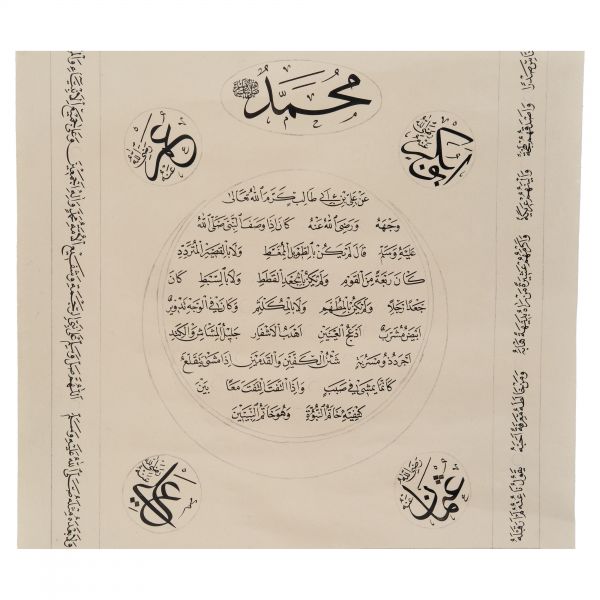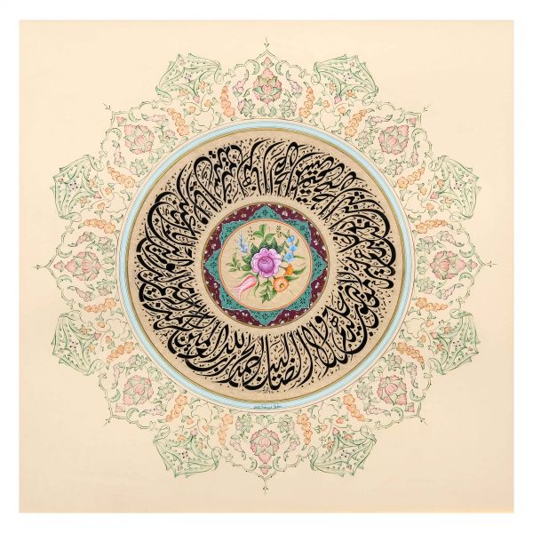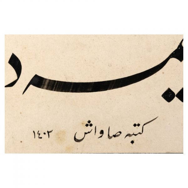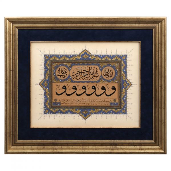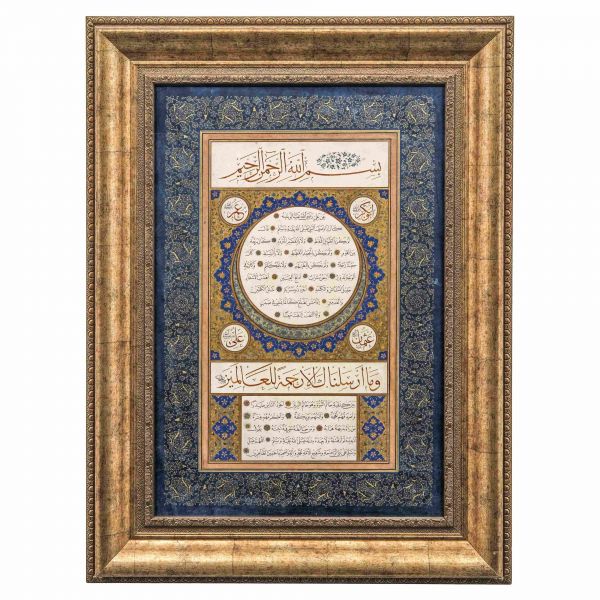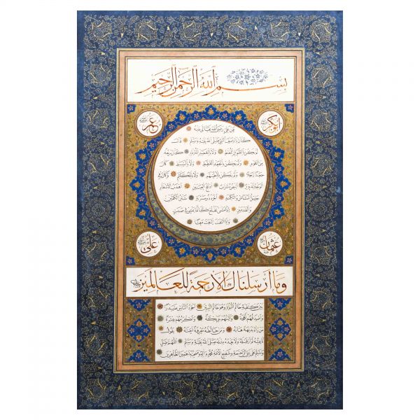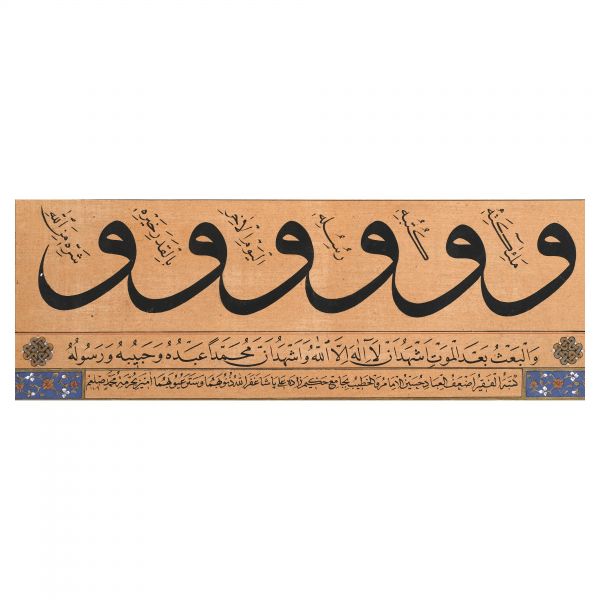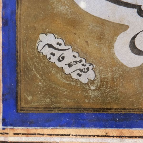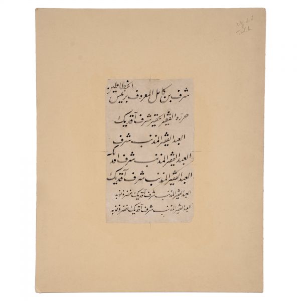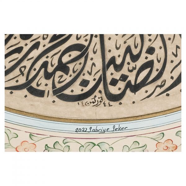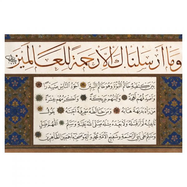 Yazıda Arapça olarak "Şeref bin Kâmil el-marûf bi-Reîsi´l-Hattâtîn, harrarahû el-fakîr el-hakîr Şeref Akdik" ve arkasında tekrar eden benzer cümleler yazılıdır.