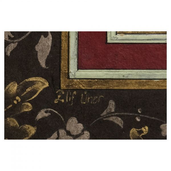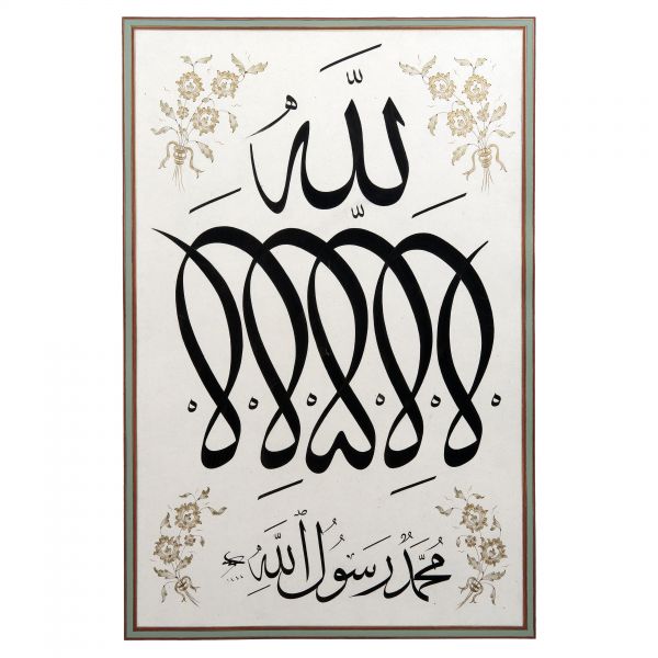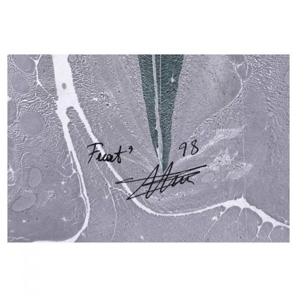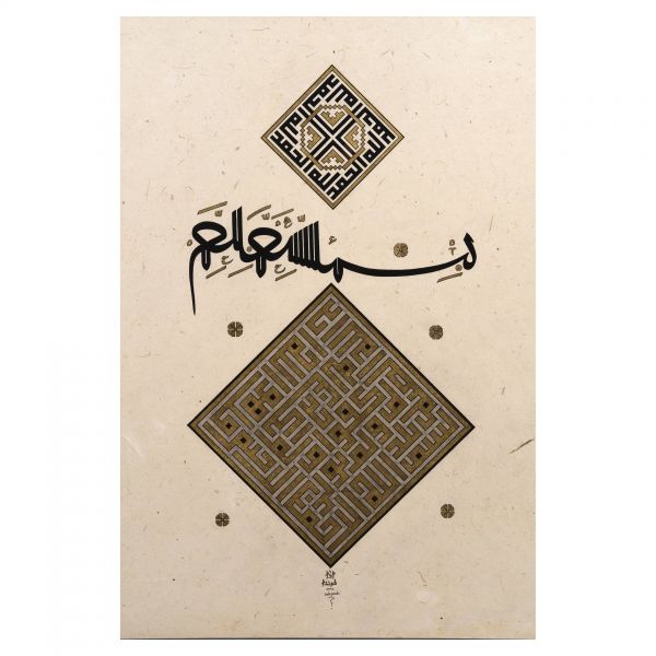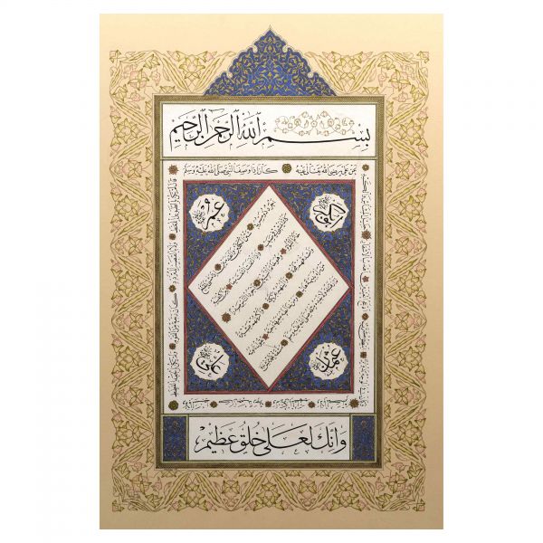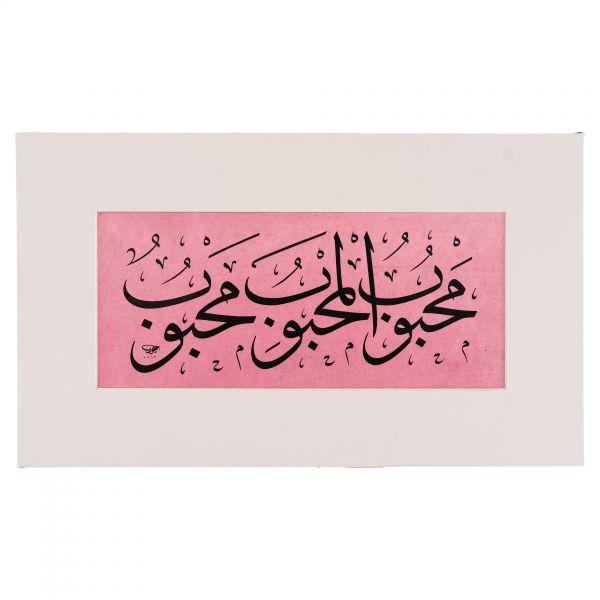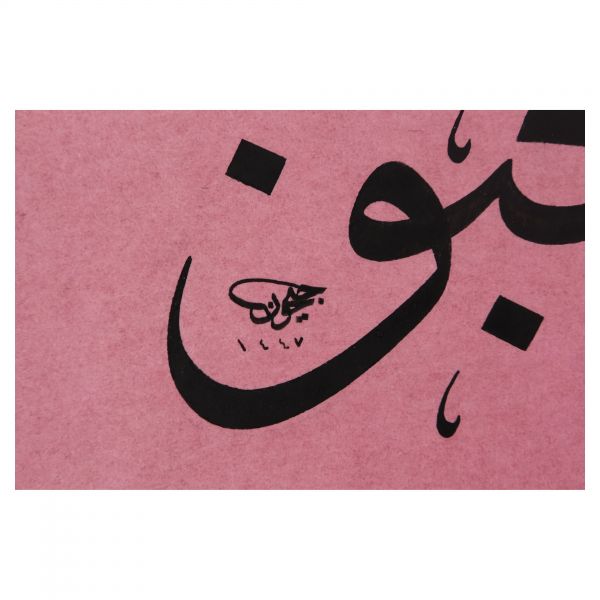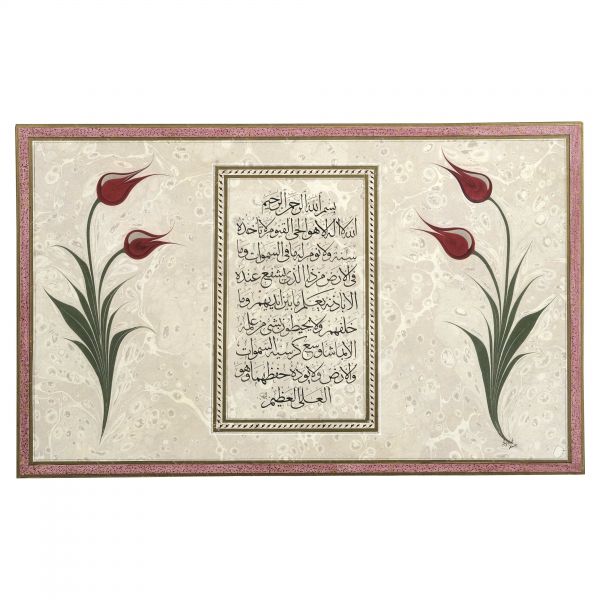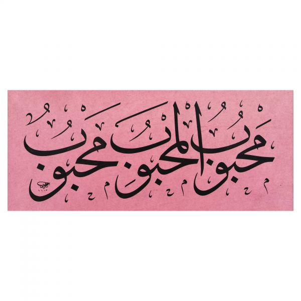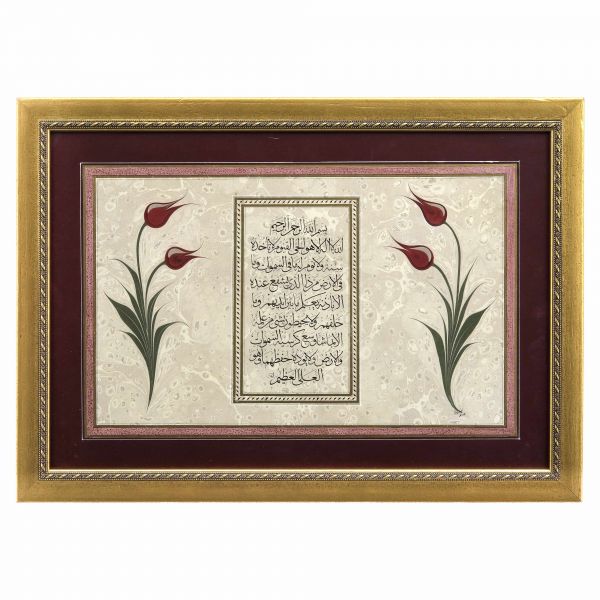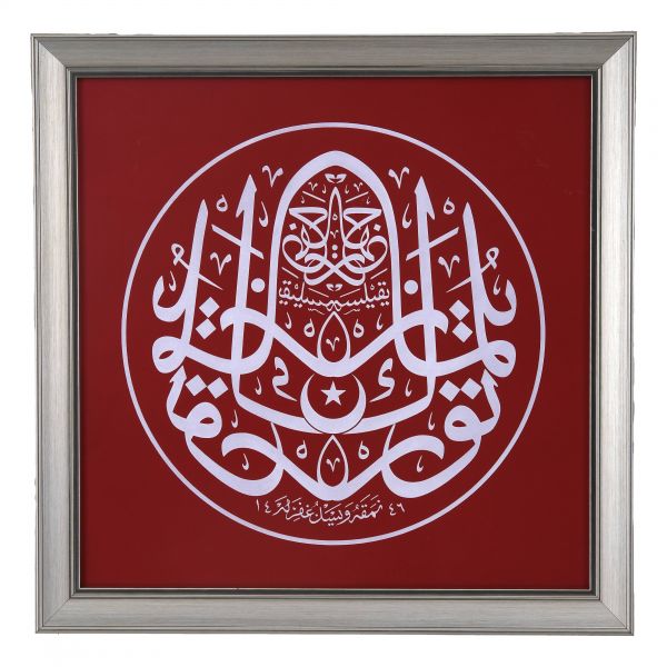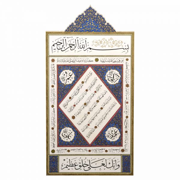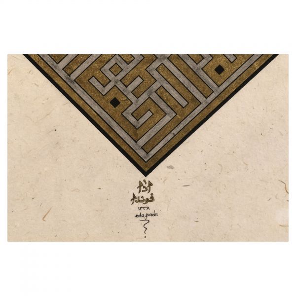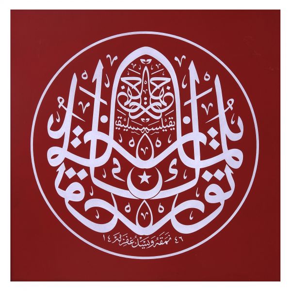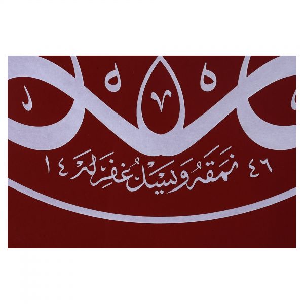 Yazı beyaz mürekkeple kırmızı zemin üzerine özel bir teknikle uygulanmıştır. Sanatçının meşhur istifinden sınırlı sayıda üreterek arz ettiği eserlerdendir.
