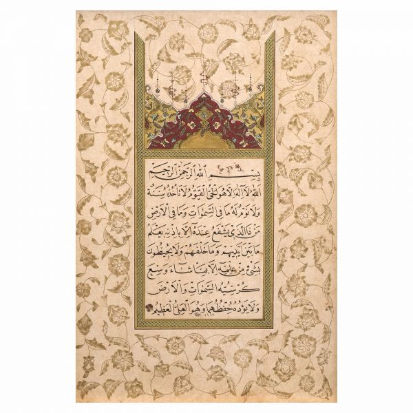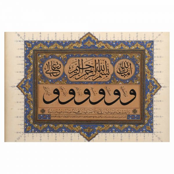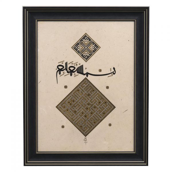 Türk İslam Eserleri Müzesi´nde sergilenen Ahmed Karahisârî Albümü´ndeki müselsel besmele ve makılî yazının takliden yazılmış örneği. Üst kısımda "Allah" ve "Muhammed", ortada müselsel besmele, altta da besmele ve İhlâs Sûresi yazılıdır.