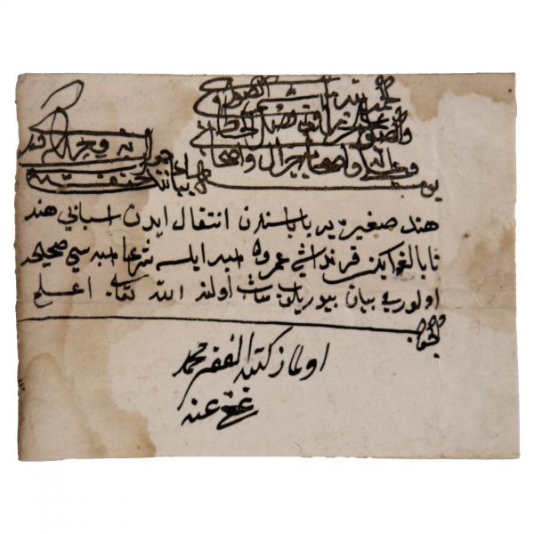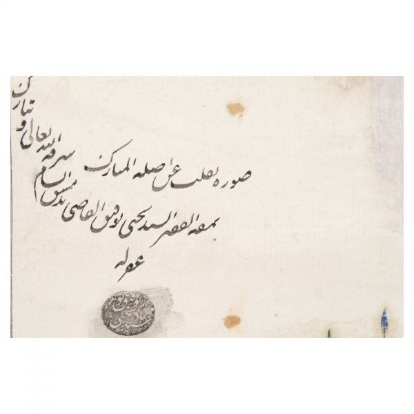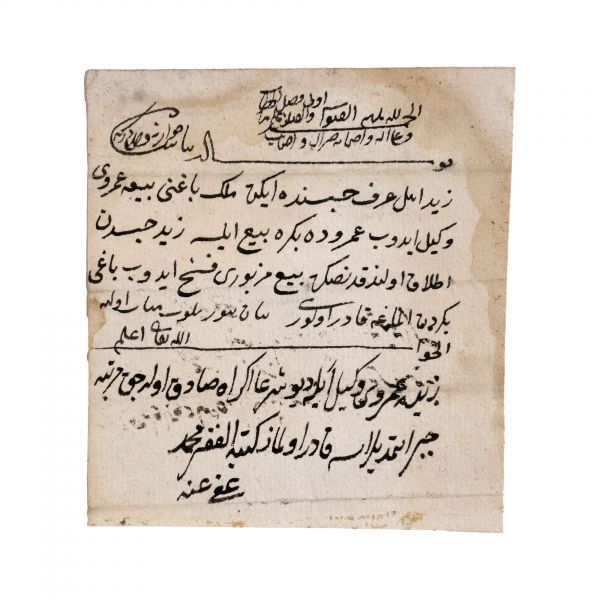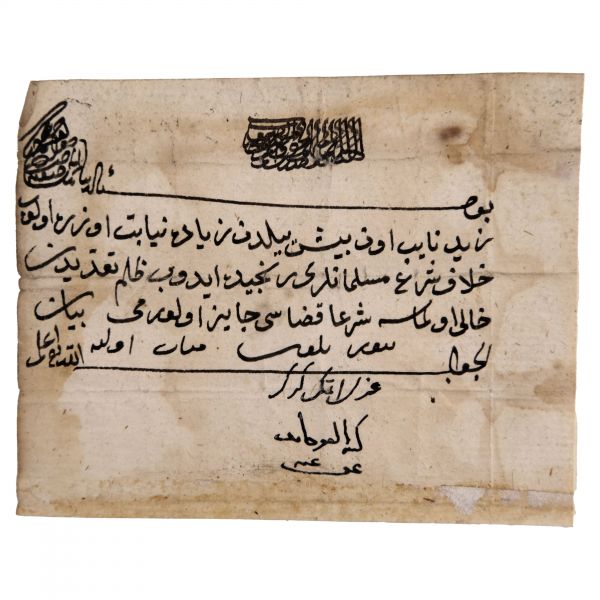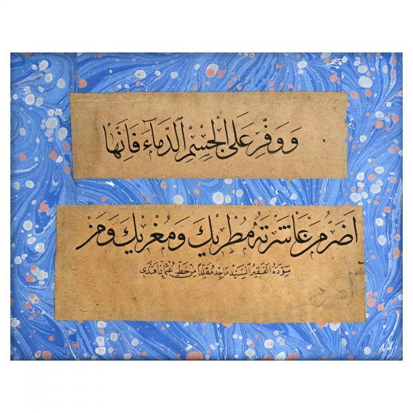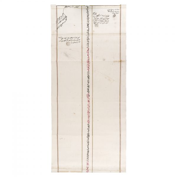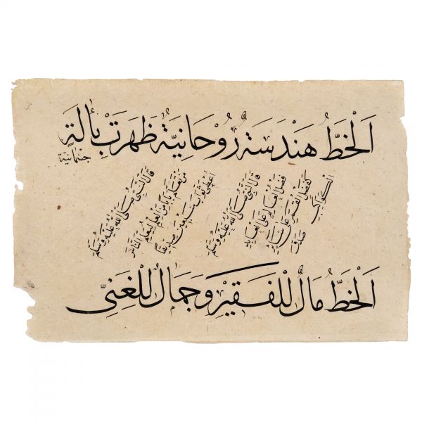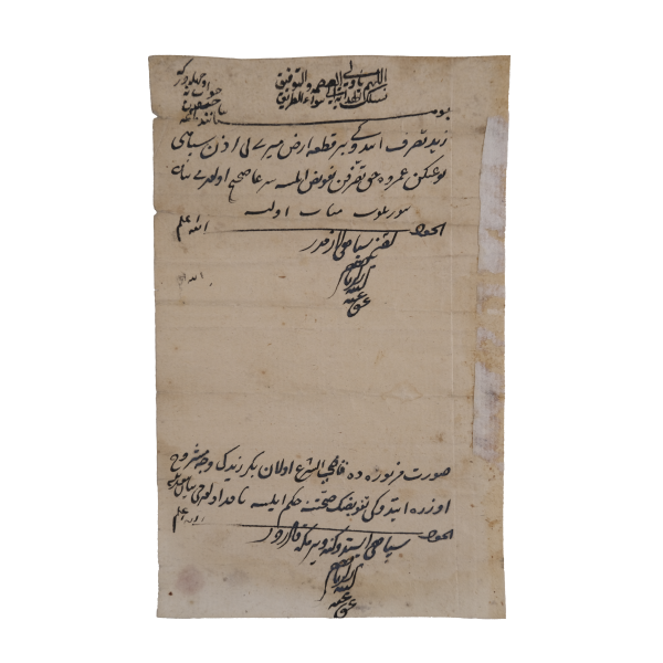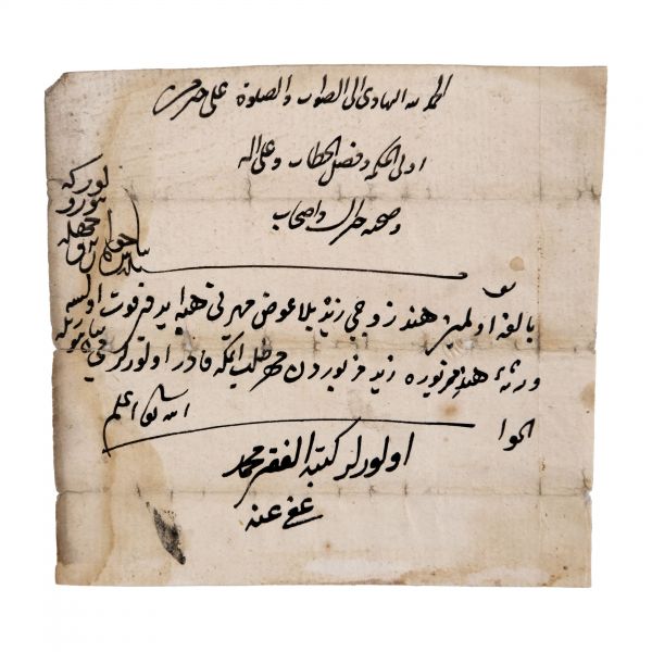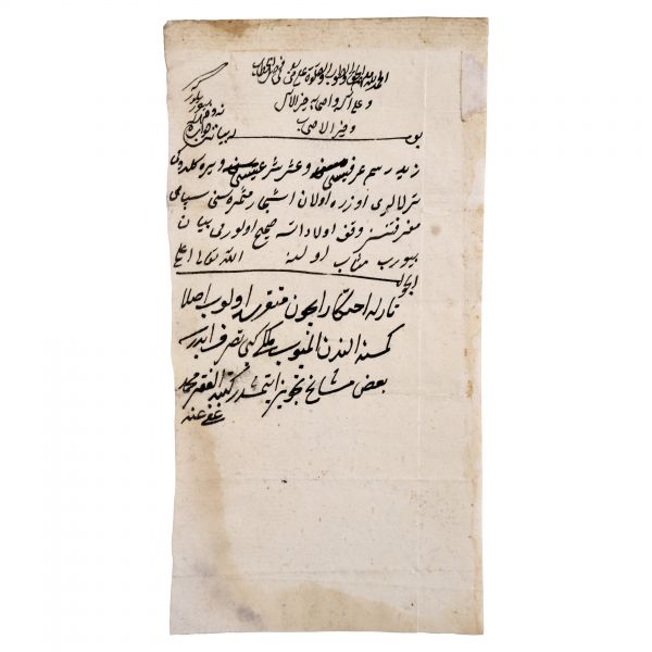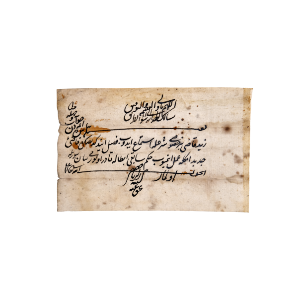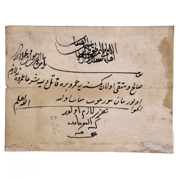* Yazının baş kısmı, mahir bir hattat tarafından sonradan tamamlanmış, diğer kısımlar da restore edilmiştir. Kağıdın altında ve sol tarafında kırılma izleri vardır. Fotoğrafları inceleyerek pey veriniz.