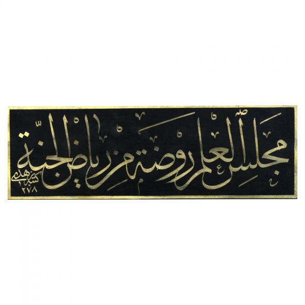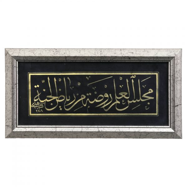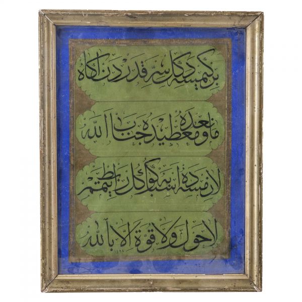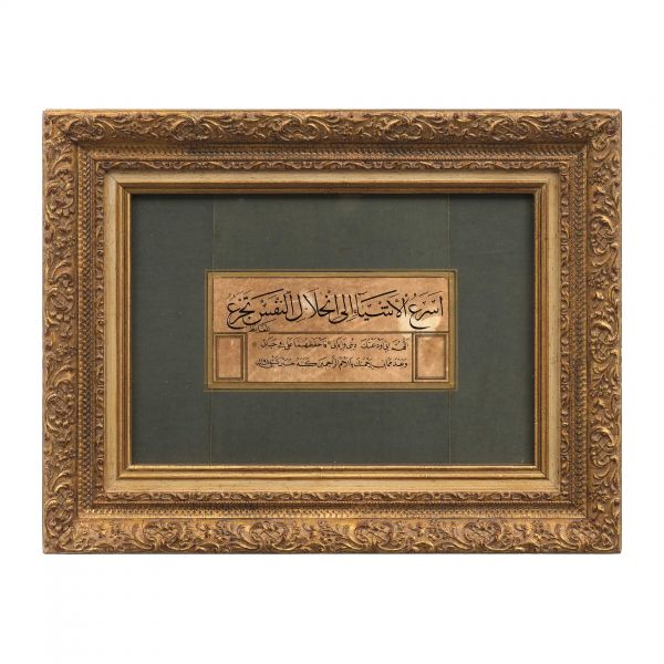 Sülüs yazılarda Arapça olarak Hazreti Ali´nin ve ünlü hattat Yâkut el-Musta´sımî´nin hüsnihatta dair vecizeleri, nesih kısımlarda hadis-i şerifler yazılıdır.
