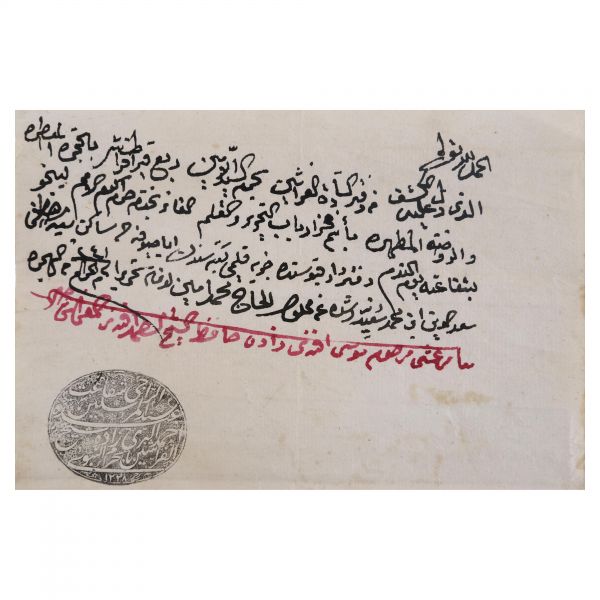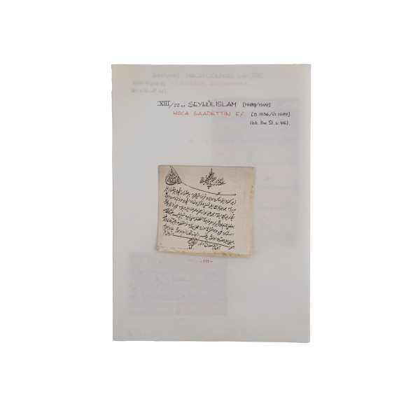 Defterdarlık katiplerinden Ayasofyalı Seyyid Mustafa Sadeddin´den boşalan dörtte bir kıratlık feraşet görevine Hacı Mehmed Emin´in atandığını bildiren belge. Kırmızı mürekkepli yazıda "Merhum Musa Efendizâde Hâfız Şeyh Ahmed Efendi" yazılıdır.