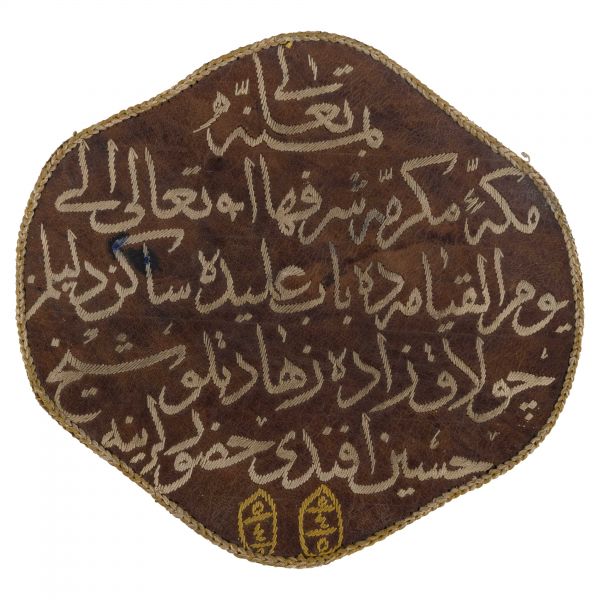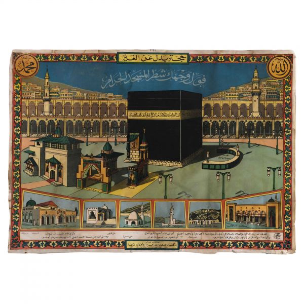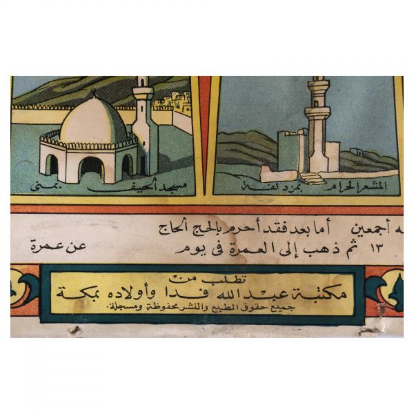Kabe ve önemli mescidlerin resminin olduğu Arapça hac ve umre yapma belgesi. Alttaki beyaz kutuda hac ve umre için tarih, kişi ve şahitler için boşluk bırakılmıştır. Belgeyi alan kişinin ihrama girerek haccın farz, vacib, sünnet ve hükümlerini yerine getirdiği, sonra umreye de katıldığı bilgisi hazır olarak yazılıdır. Belge tamamen Arapçadır. En üstte "Bedel ani´l-Gayr" yani "Başkası Yerine Hac" başlığı vardır. Buradan belgenin vekâleten hacca gelenler için olduğu anlaşılıyor. Başlığın altında mihraplara yazılan iki âyetten biri olan "(Namazda) yüzünü Mescid-i Haram tarafına çevir!" mealindeki Bakara 149. âyeti yazılıdır.