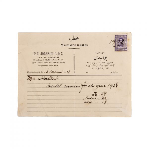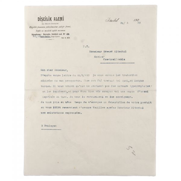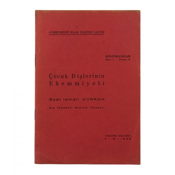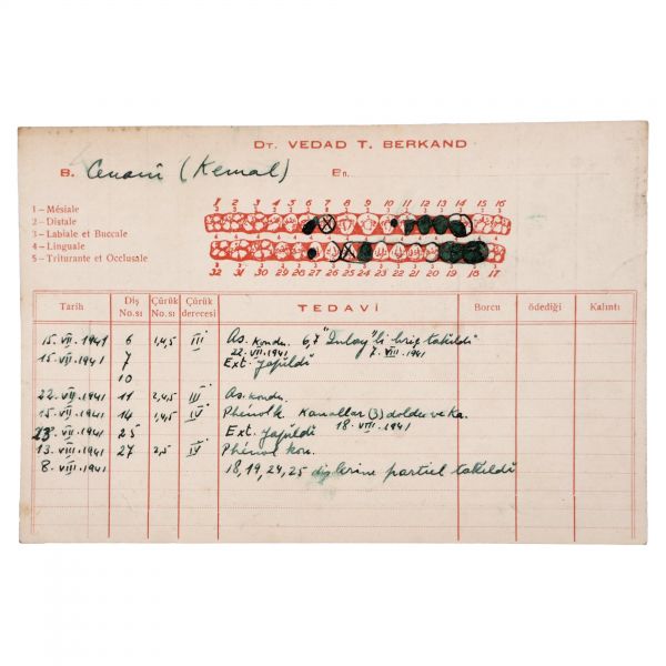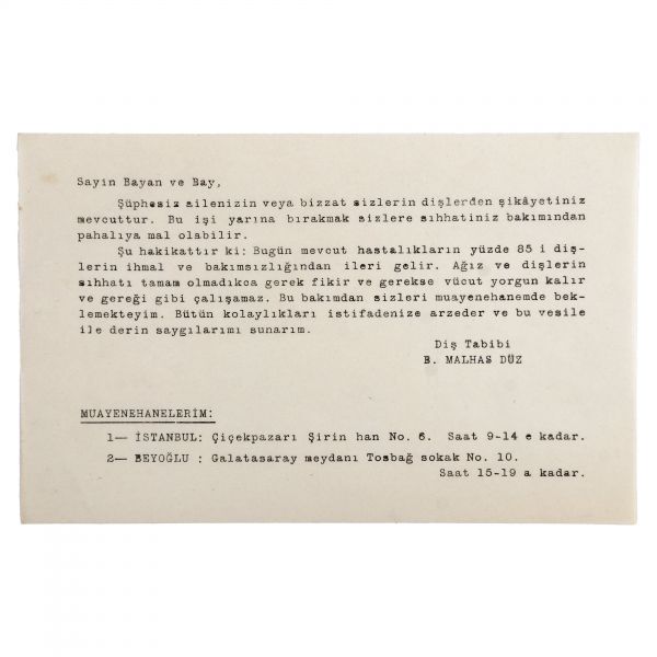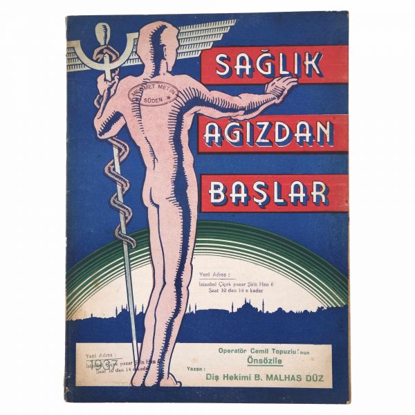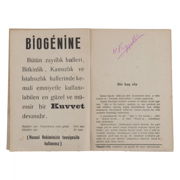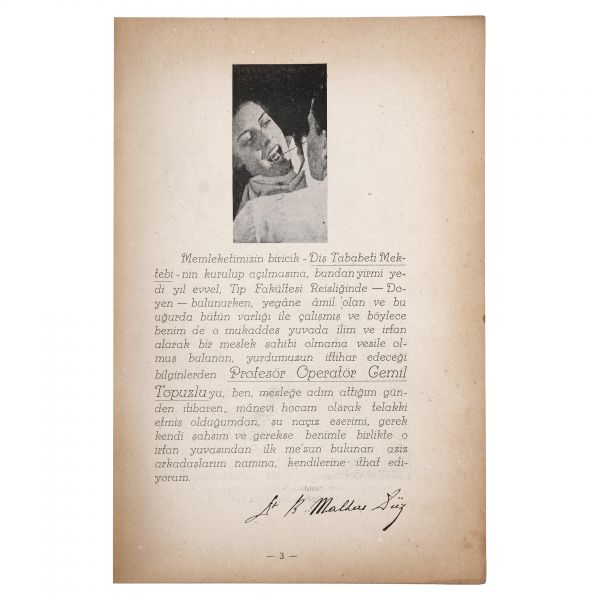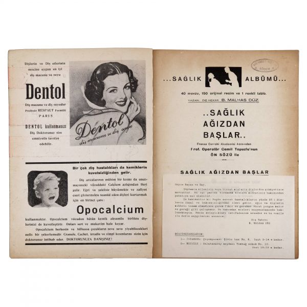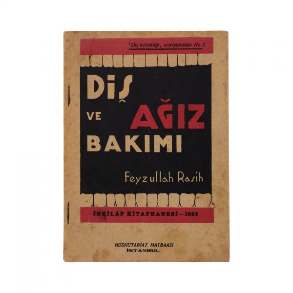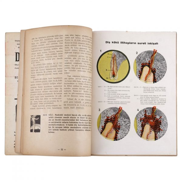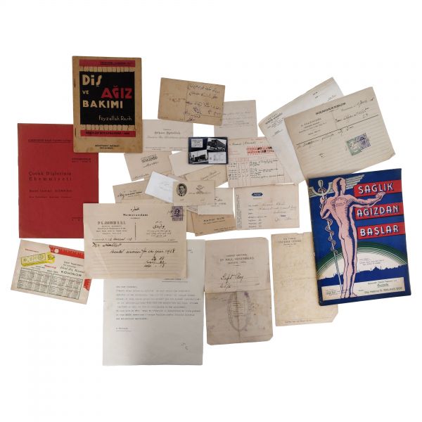 Lot içeriği: 1) DİŞ VE AĞIZ BAKIMI ("Diş Hekimliği" Neşriyatından No. 2), Feyzullah Rasih, 1933, İnkılâp Kitaphanesi, 28 sayfa, 14x20 cm. (Yazarından ıslak imzalı). 2) SAĞLIK AĞIZDAN BAŞLAR (40 mevzu, 150 orijinal resim ve 1 renkli tablo), yazan: Diş Hekimi B. Malhas Düz ("Operatör Cemil Topuzlu´nun önsözile), 1937, Ekspres Basımevi, 72 sayfa, 20,5x28 cm. 3) ÇOCUK DİŞLERİNİN EHEMMİYETİ (Konferanslar Seri: 1 - Kitap: 6), Suat İsmail Gürkan, 1938, Cumhuriyet Halk Partisi Yayını, Recep Ulusoğlu Basımevi, 10 sayfa, 16,5x24 cm. 4) 17 adet diş hekimi kartviziti (Eski ve yeni harfli, Fransızca karışık). 5) 5 adet diş hekimi antetli reçete/fatura (Eski ve yeni harfli, Fransızca karışık). 6) "Dişçilik Alemi" mecmuasının antetinin bulunduğu kâğıda çekilmiş, 1933 tarihli, Fransızca daktilo mektup. 7) Kohinor Diş Macunu reklamlı, 1952-1953 takvimli kurutma kâğıdı. 8) "Dt. Vedad T. Berkand" antetli hasta tedavi kartı (1941 yılında doldurulmuş). 9) ABD merkezli diş ilaçları üreticisi Novocol´un Türkiye mümessili tarafından diş hekimi Necmi Akol´a gönderilmiş, ilgili firma tarafından çıkarılan Modern Dentistry mecmuası abonelik kartı (Necmi Akol tarafından doldurulmuş; 1954 yılında postadan geçmiş ). 10) Hayrabola (Tekirdağ) Diş Tabibi Mehmed Haşim tarafından, Babaeski (Kırklareli) Hükümet Tabibi Mustafa Raşid Bey´e gönderilmiş, Osmanlıca notlu kartpostal.