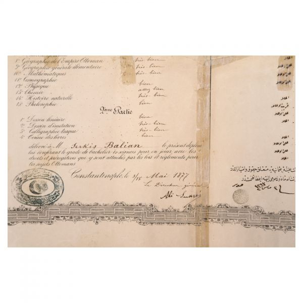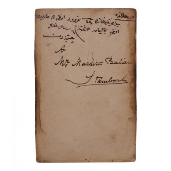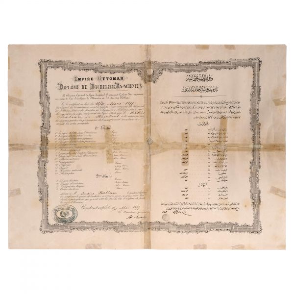 Lot içeriği: Sarkis Balyan´ın şehbenderlik vazifesi hakkında kaleme alınmış Sultan İkinci Abdülhamid tuğralı ferman, Sarkis Balyan´ın, Ali Suavi´nin ıslak imzasını taşıyan Galatasaray Lisesi diploması, Sarkis Balyan´ın mührü, Sarkis Balyan ve aile üyelerinin, üçü ithaflı ve imzalı sekiz adet kabin fotoğrafı.