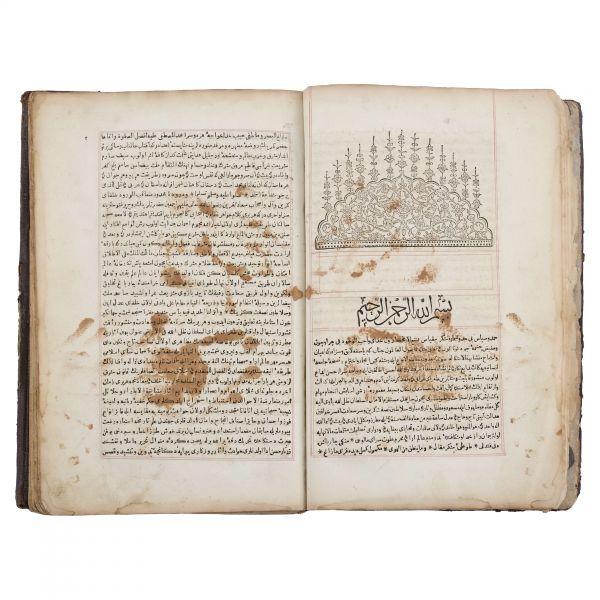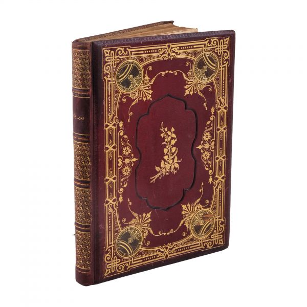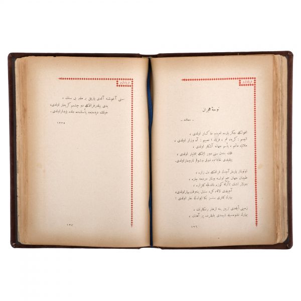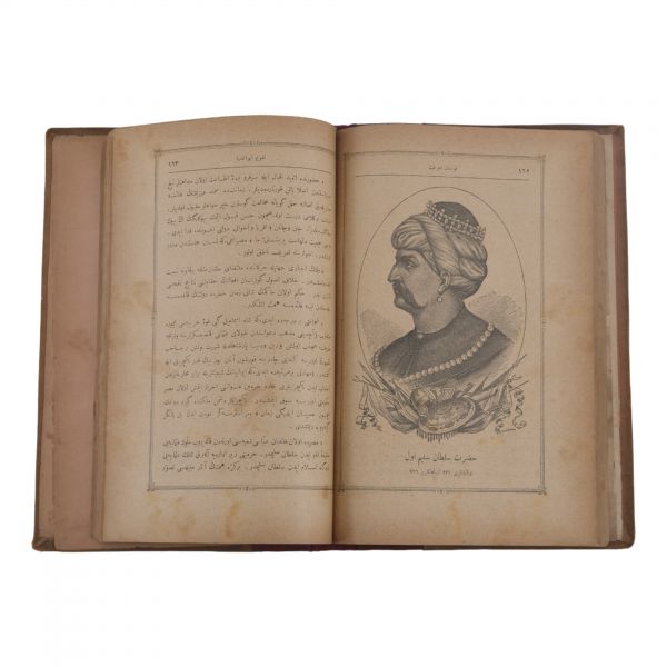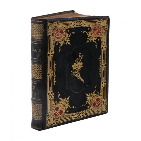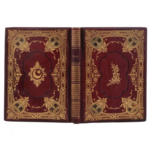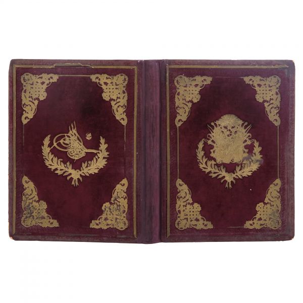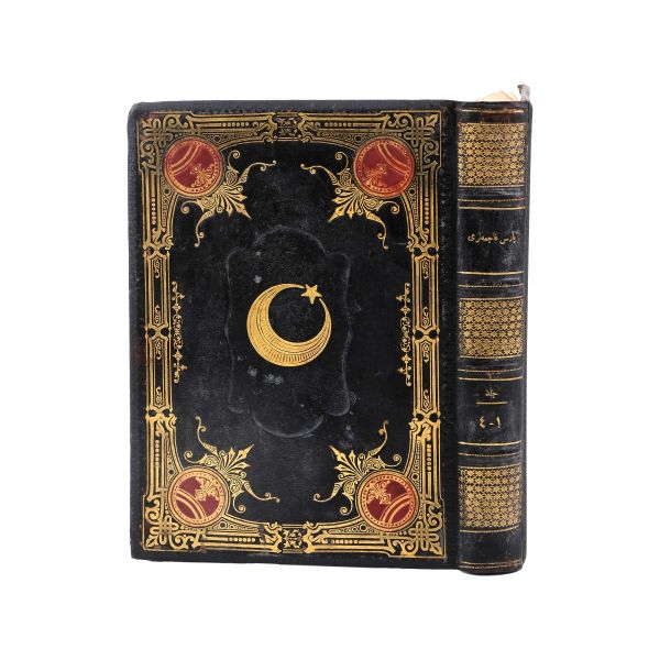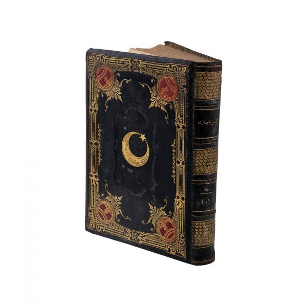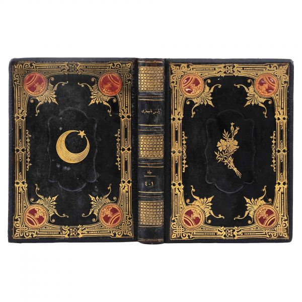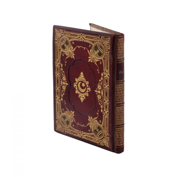 Kapakları hilal-yıldız ve floral desenlerle süslenmiş, sırtı altın yaldız panelli, sayfa kenarları altın yaldızlıdır.