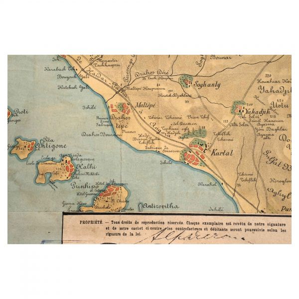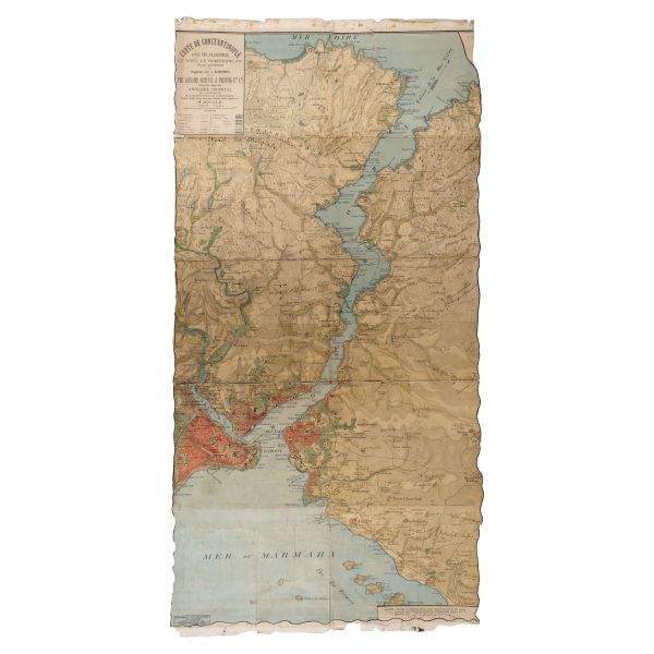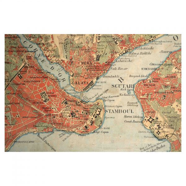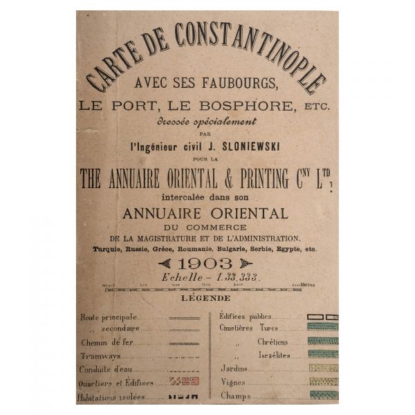 İstanbul´un banliyölerini, limanını, Boğazını vb. gösteren, bazı yerleşim bölgelerinin bugün kullanılmayan eski isimlerini içeren harita; Osmanlı İmparatorluğu ve çevresindeki bölgelerde yayımlanan Fransızca ticaret ve idari rehber yıllığının 1903 nüshası için hazırlanmıştır. Harita başlığı: "CARTE DE CONSTANTINOPLE avec ses Faubourgs, le port, le Bosphore Etc. dressee specialement par l´ingenieur Civil J. Sloniewski pour l´indicateur Oriental Annuaire du commerce de la Magistrature et de l´administration (Turquie, Russie, Grece, Roumanie, Bulgarie, Serbie, Egypte, etc.) -1903-"