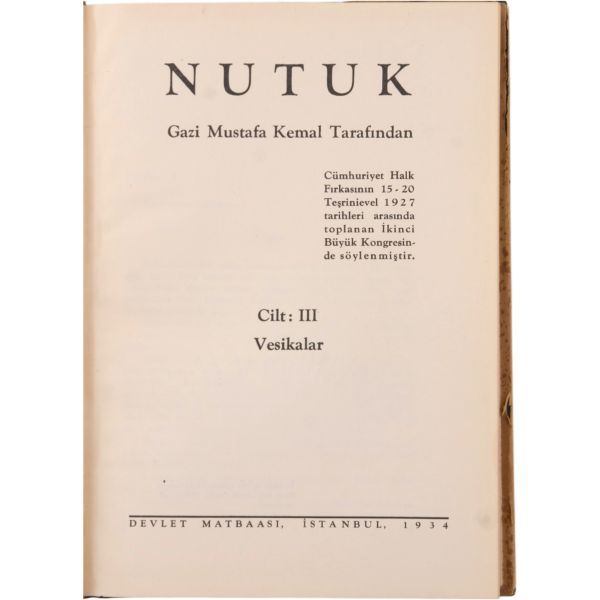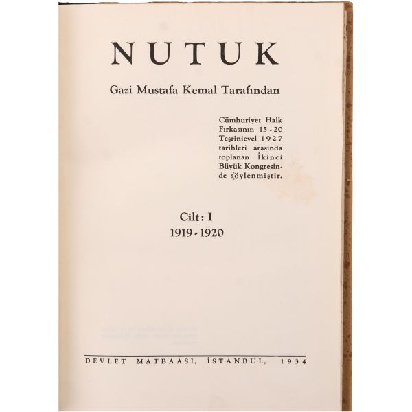 Atatürk'ün Nutuk adlı eserinin Latin harfleriyle ilk basımı... Bu basım, Nutuk'un Atatürk'ün sağlığında basılmış, bütün belgeleri içeren, en kapsamlı ve son halidir.
