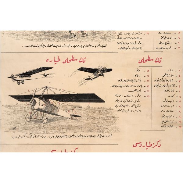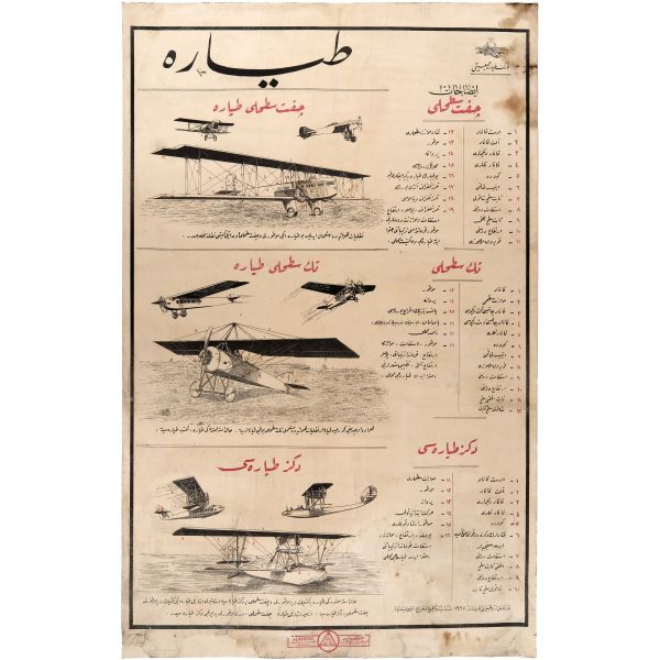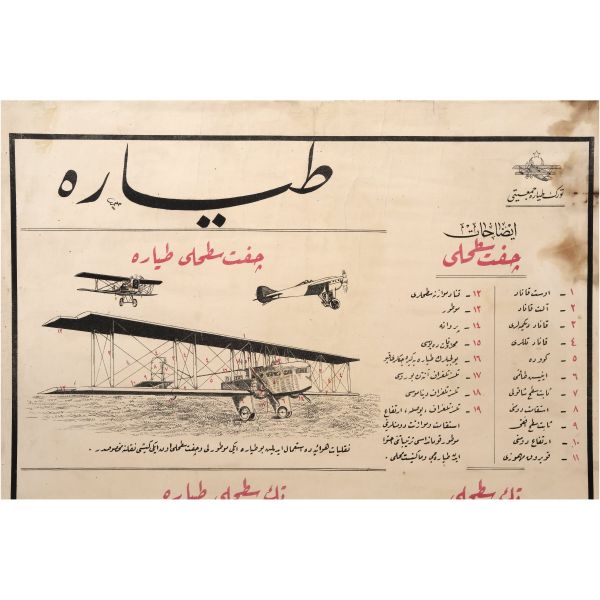 Afişte tayyareler havada ve karadayken resmedilmiştir. Uçakların karadayken çizilmiş resimlerinin aksamları numaralandırılmış ve bu numaralara karşılık gelen aksamların hemen yan tarafındaki listede isimleri verilmiştir. Uçakların resimleri altında yer alan açıklamalardaysa kaç kişilik olduğu ve teknik özelliklerinden bahsedilmiştir. Deniz tayyarelerinin kuyruklarında "İstanbul" ve "İzmir" yazılıdır. Afişin yazıları meşhur hattat Halim Özyazıcı tarafından yazılmıştır. Halim Efendi’nin imzası, afişim başlığının altında görülmektedir.