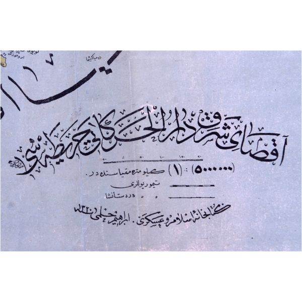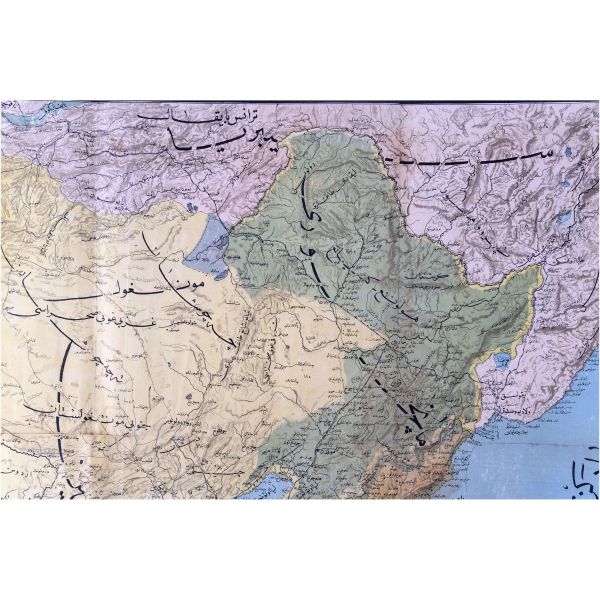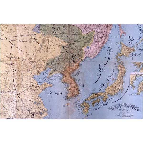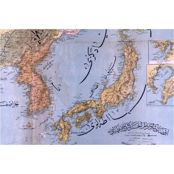 1904-1905 Rus Japon Savaşının yaşandığı sahayı gösteren siyasî ve topografik harita. Japon adaları, Doğu Çin, Mançurya, Kore ve Güneydoğu Rusya'nın göründüğü haritanın sağ ve sol kenarlarında iki devletin savaşı idare eden komuta kademesinin portreleri vardır. Sol tarafta "Rus Harbiye Nazırı Sakarof" ile General Kropatkin ve savaşta ölen Amiral Makarof da görülüyor. Sağ tarafta Japon Harbiye Nazırı, Amiral Togo gibi isimler görülüyor. Haritada önemli merkezler ve limanlar ayrıca resmedilmiştir.