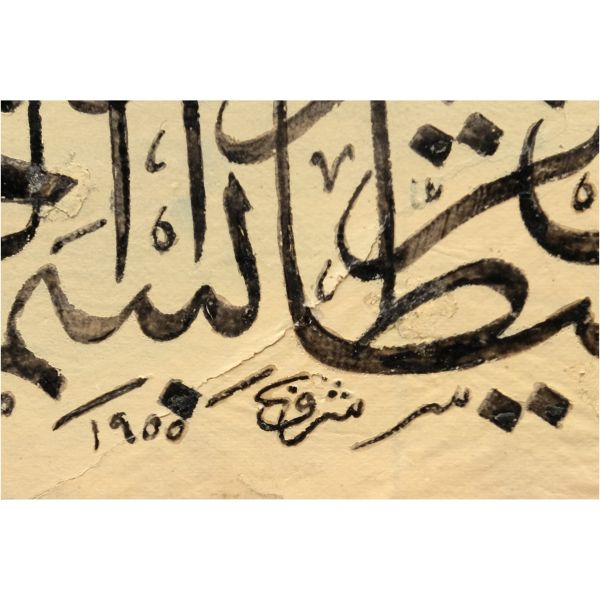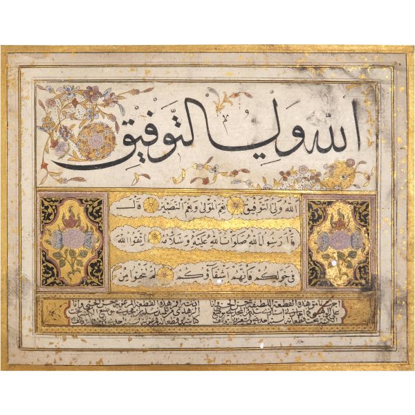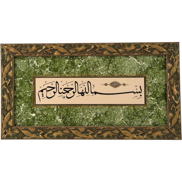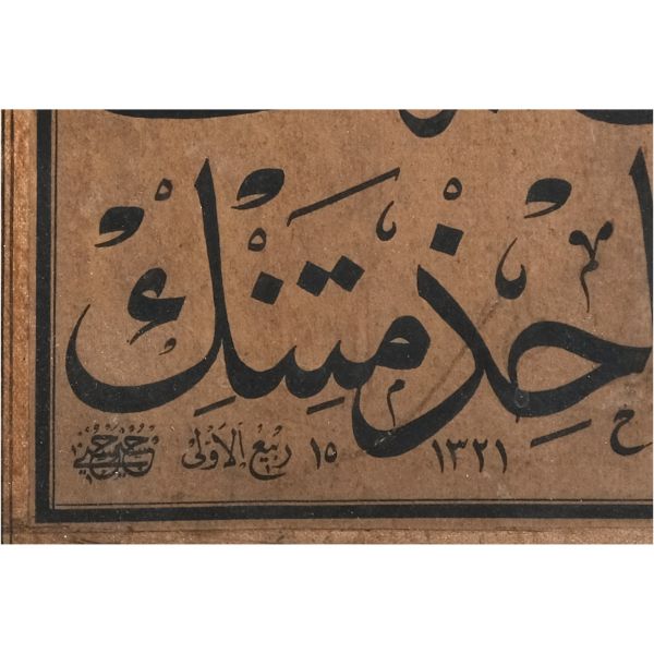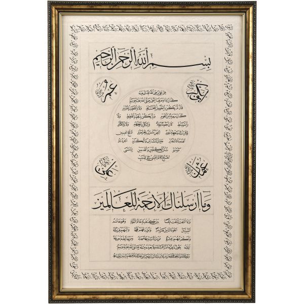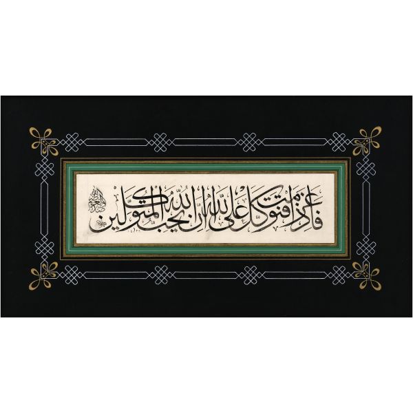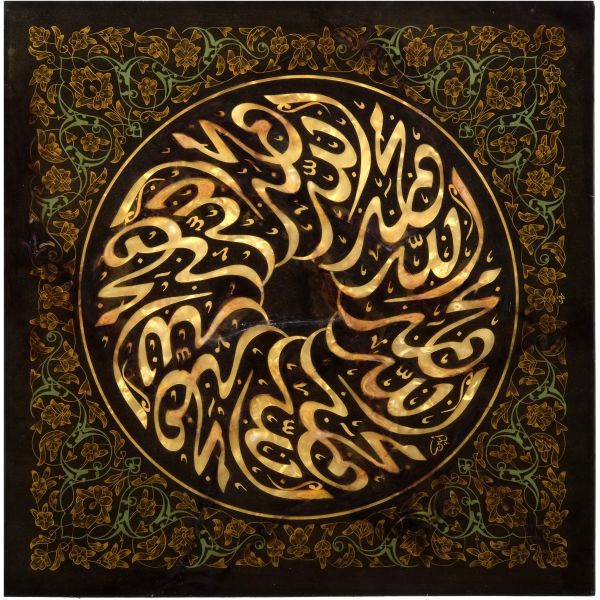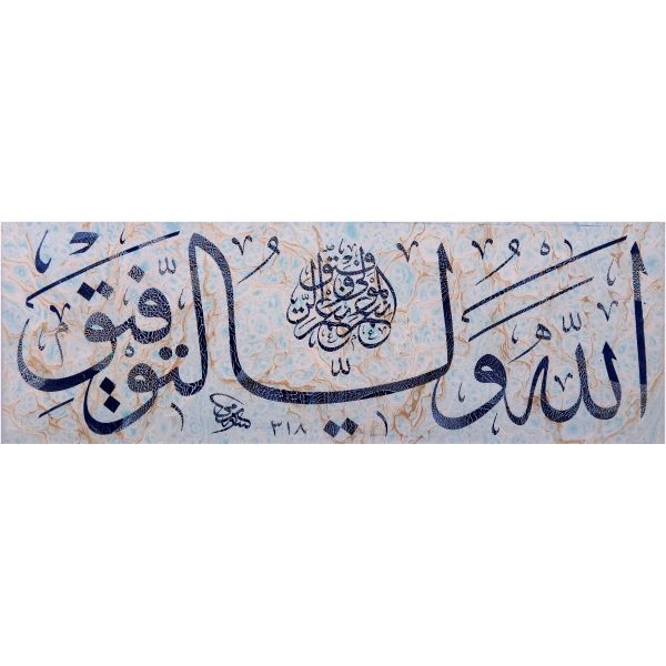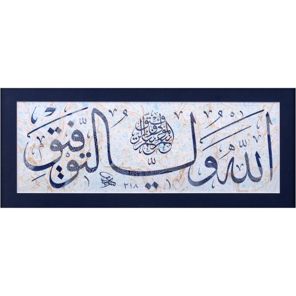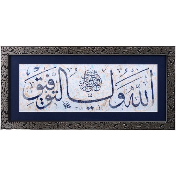 Sami Efendi´nin sülüs yazıyla "Allâhu veliyyü´t-tevfîk, ni´me´l-mevlâ ve ni´me´r-refîk" yazısından akkâse tekniğiyle hazırlanmıştır.