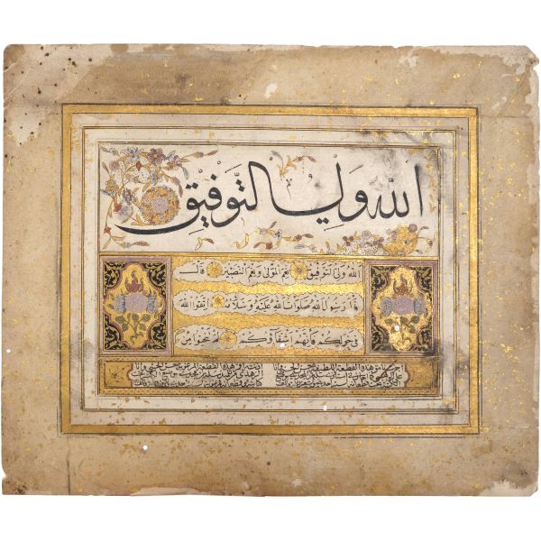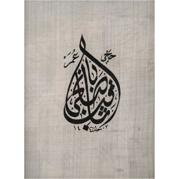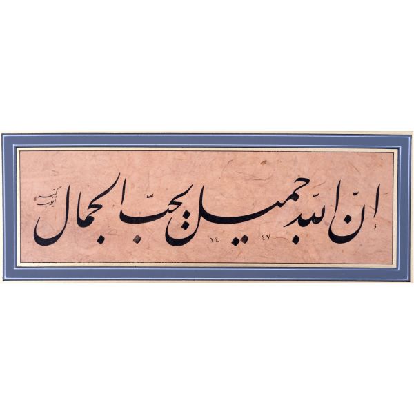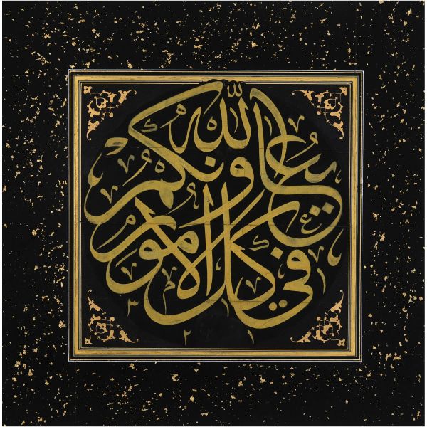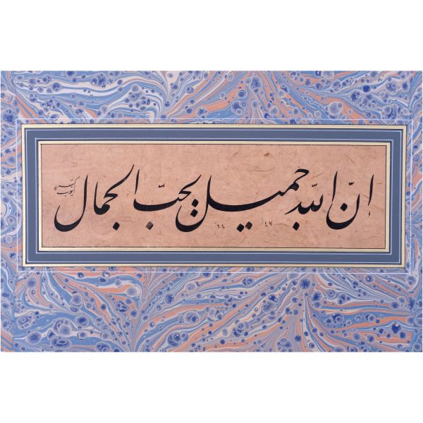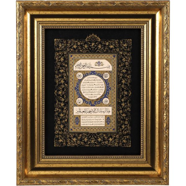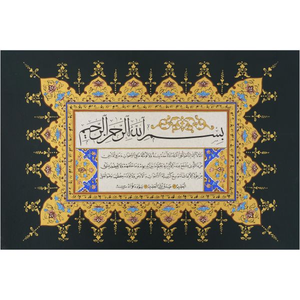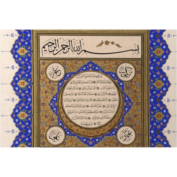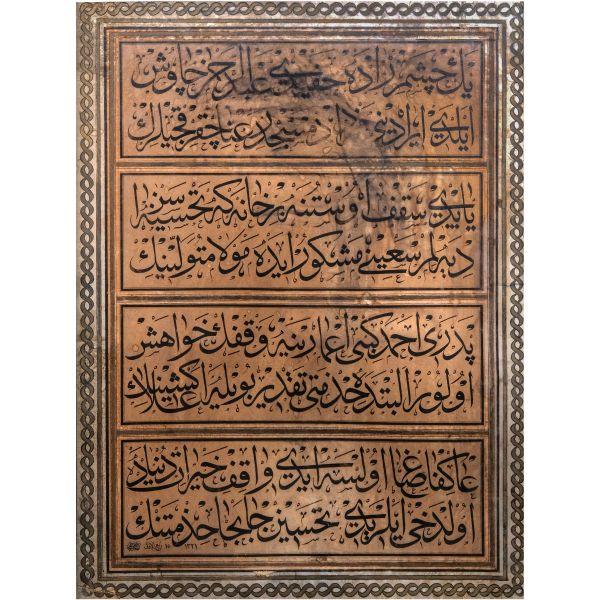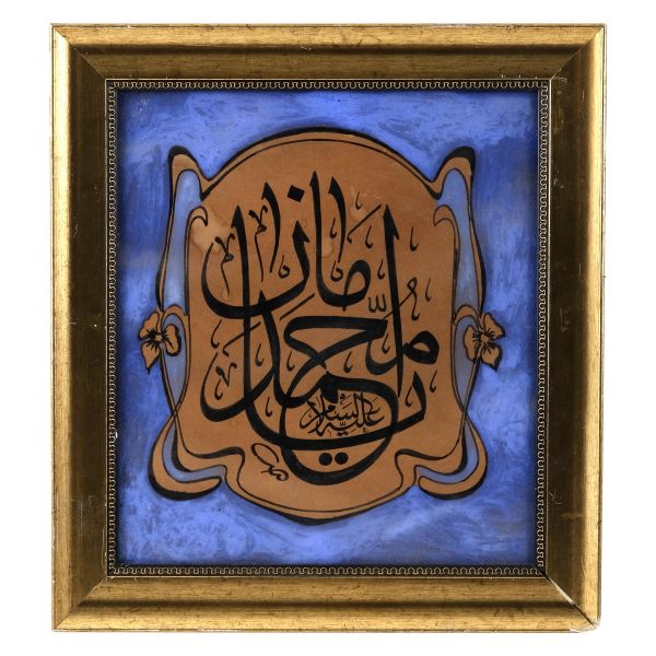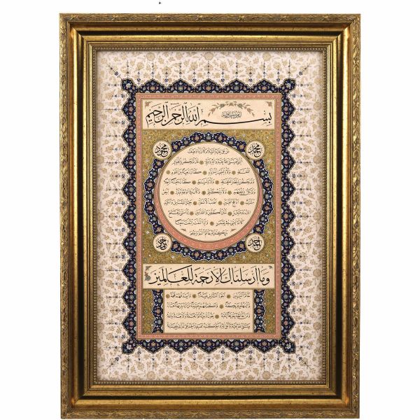 Sami Efendi´nin sülüs yazıyla "Allâhu veliyyü´t-tevfîk, ni´me´l-mevlâ ve ni´me´r-refîk" yazısından akkâse tekniğiyle hazırlanmıştır.
