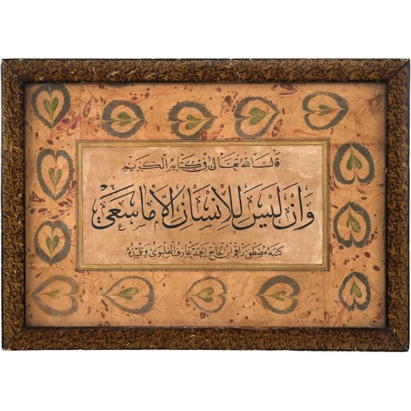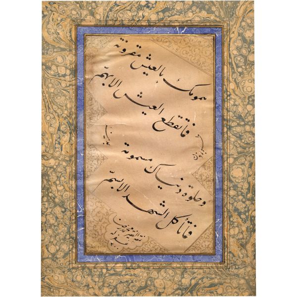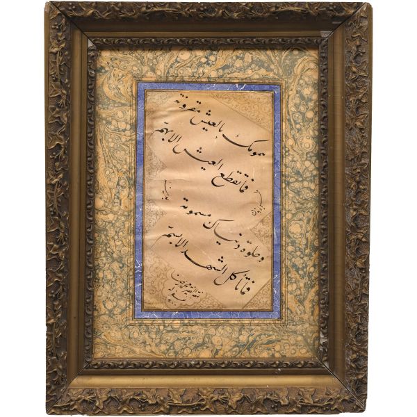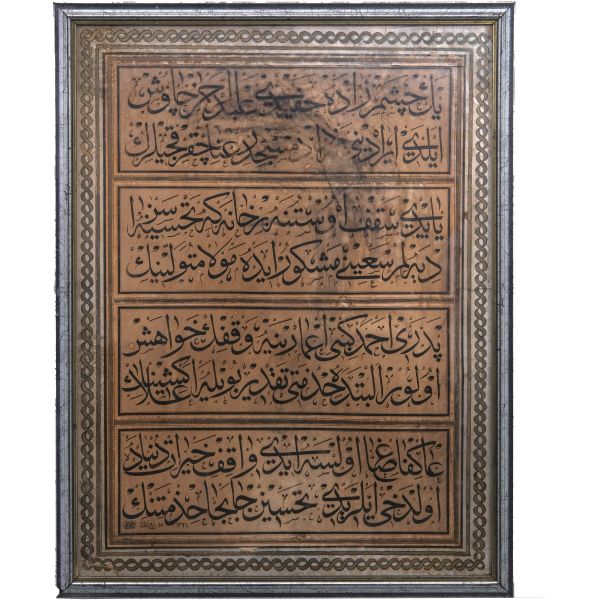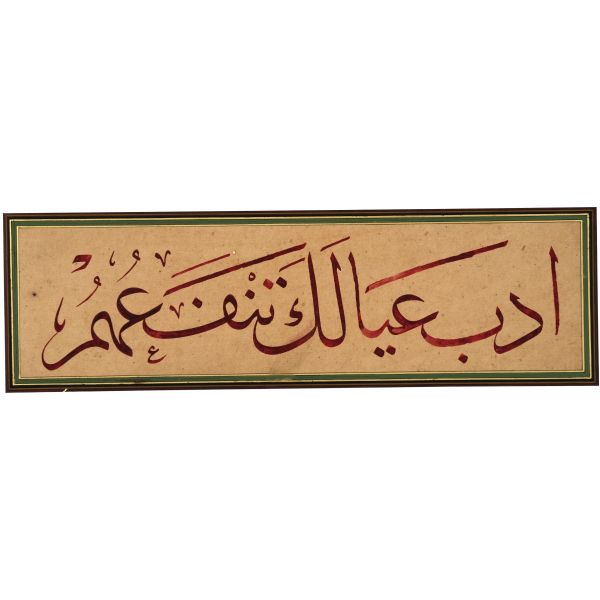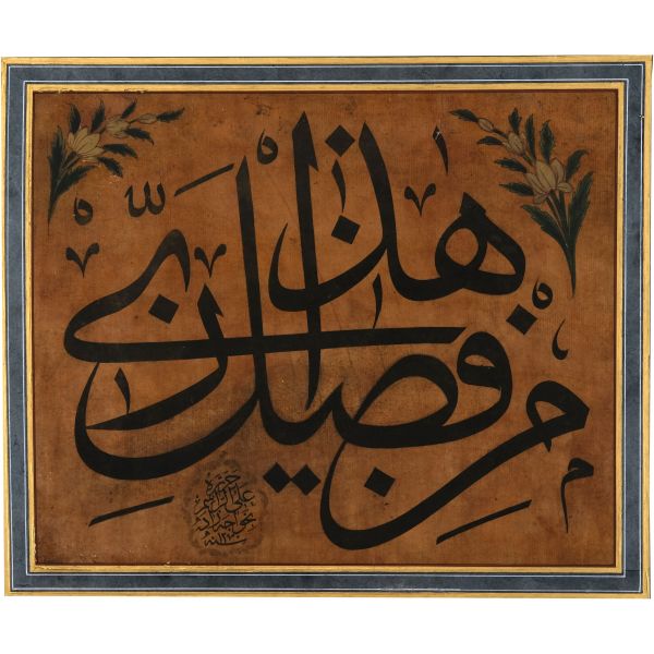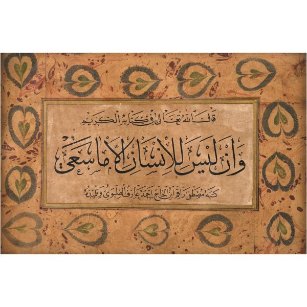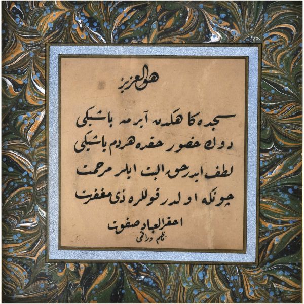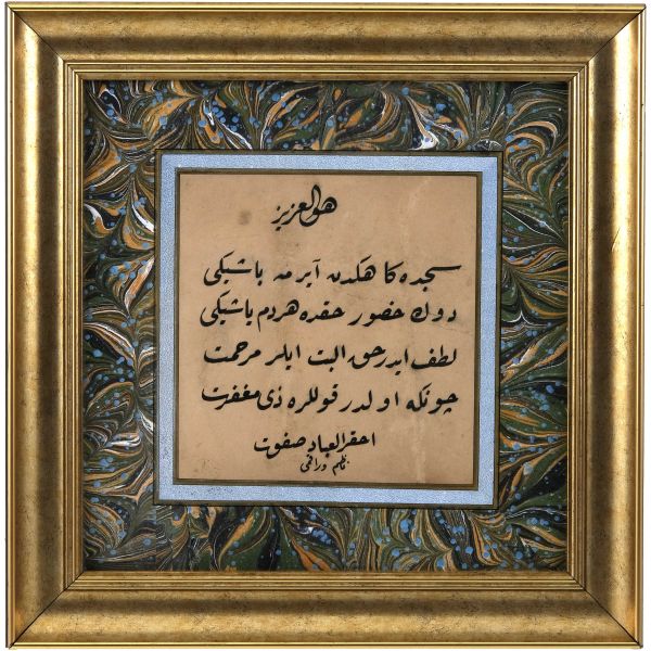 Halim Efendi´nin bir çırpıda yazarak misafiri mûsıkişinas Fâhire Fersan´a hediye ettiği; ondan Ali Alparslan´a geçen ve elden geçirildikten sonra Fatma Rikkat Kunt tarafından tezhiplenen yazı.