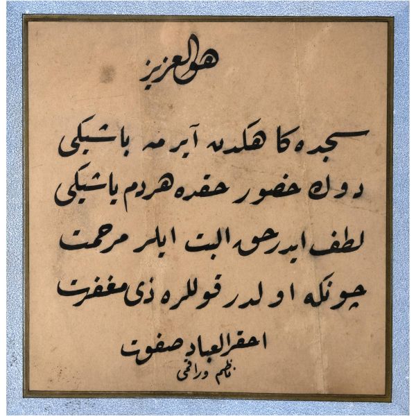 "Refîa - Mehmed Hakkı Hanım: hüsn-i hatta olan sa´y ve gayretinize binâen yazılmıştır.