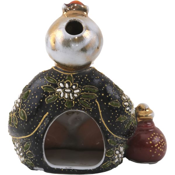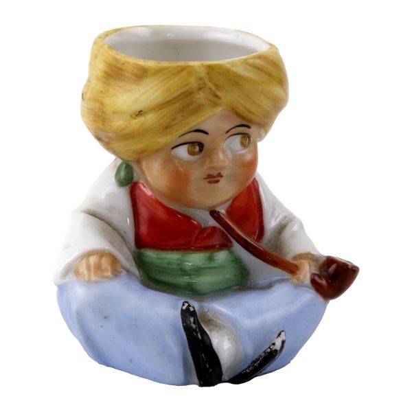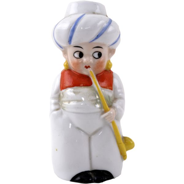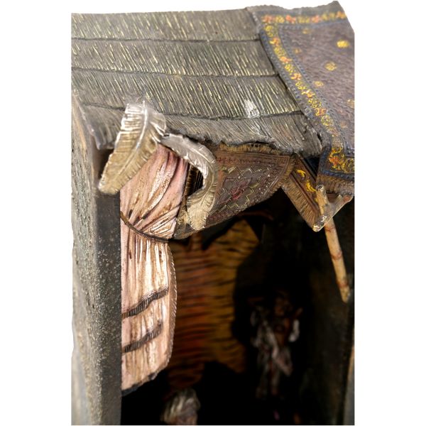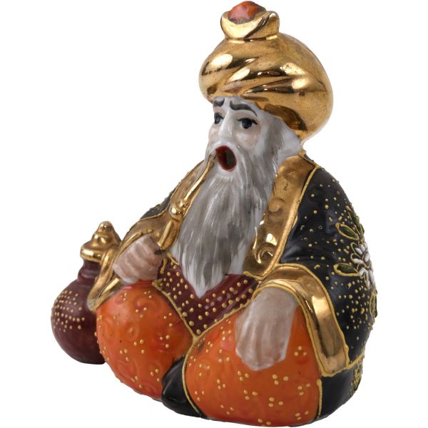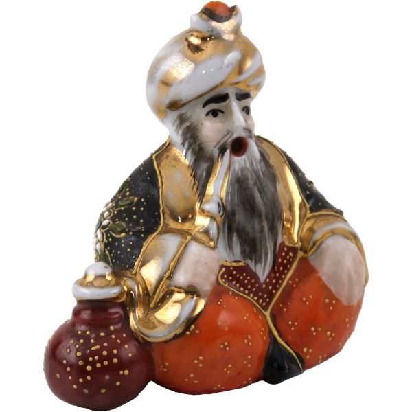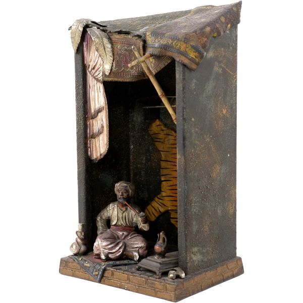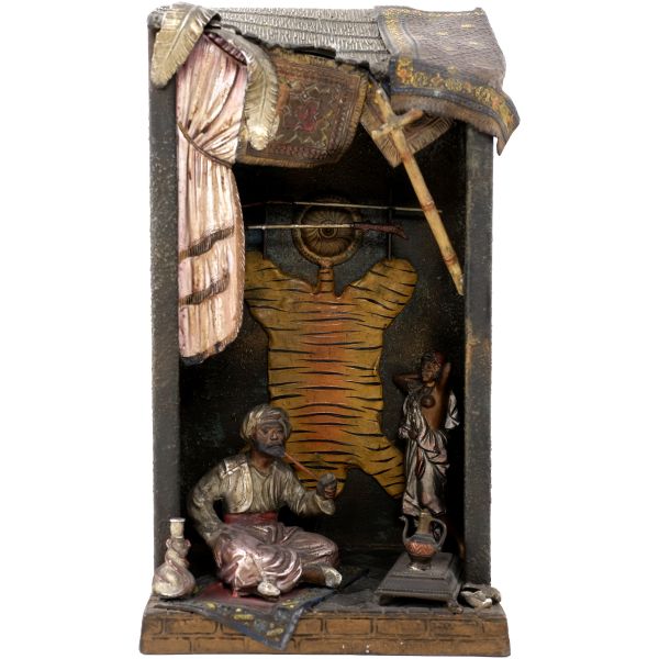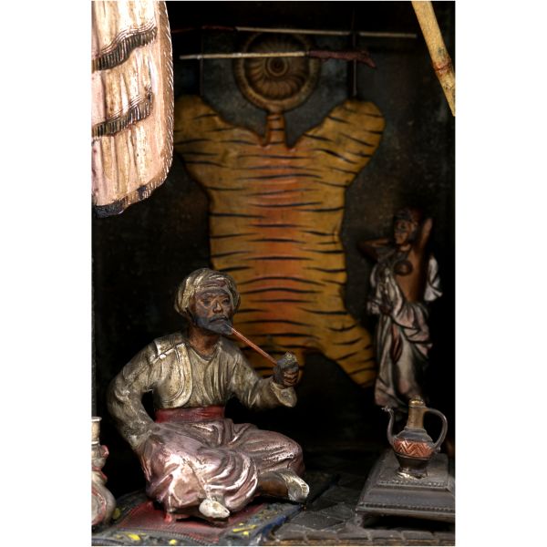 Kompozisyonda; saçağında Doğu halısı ve palmiye yaprakları bulunan bir dükkan içinde, elinde tütün çubuğuyla bağdaş kurarak oturmuş bir esnafla, cilveli bir şekilde dans eden Doğulu kadın yer almaktadır. Dükkanın duvarında ise kaplan postu, kalkan ve bir çift tüfek asılıdır. Ayrıca oryantalist sahnelerin olmazsa olmaz objelerinden kilim, çarık, nargile, ibrik gibi parçalar da dükkanın girişine serpiştirilmiştir.