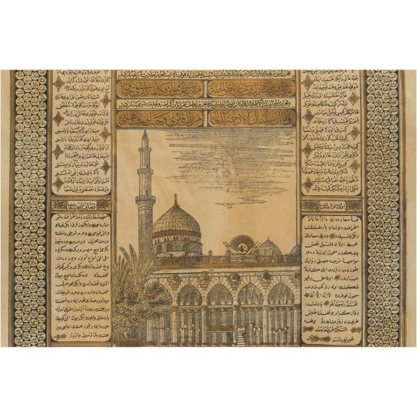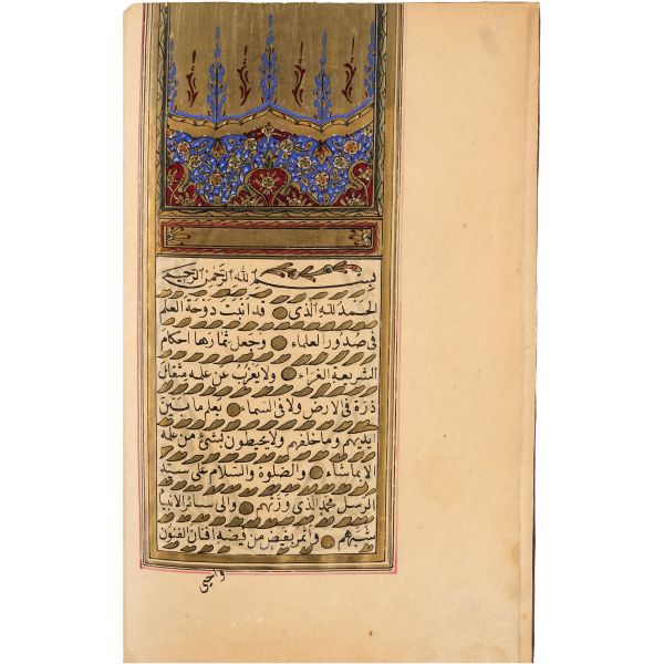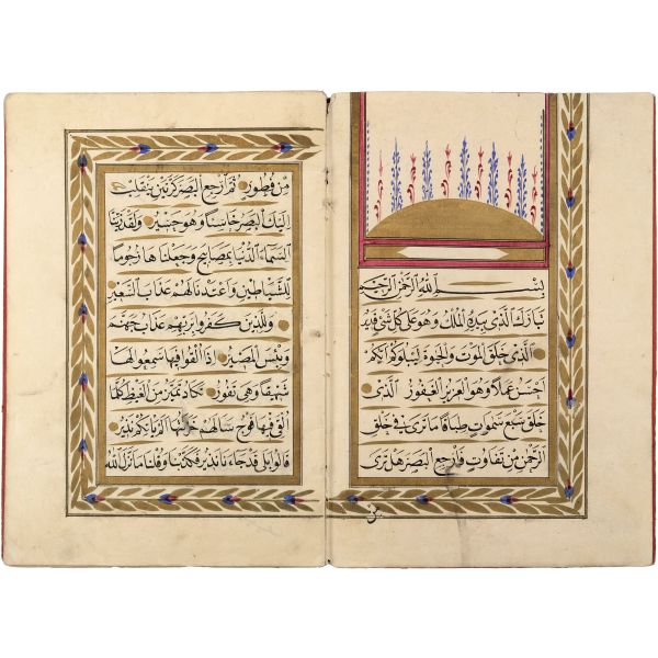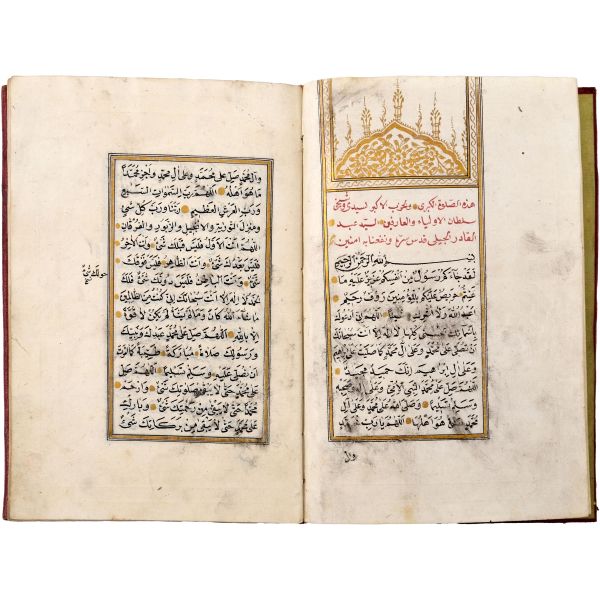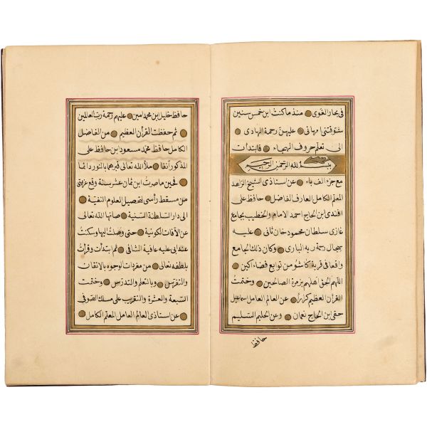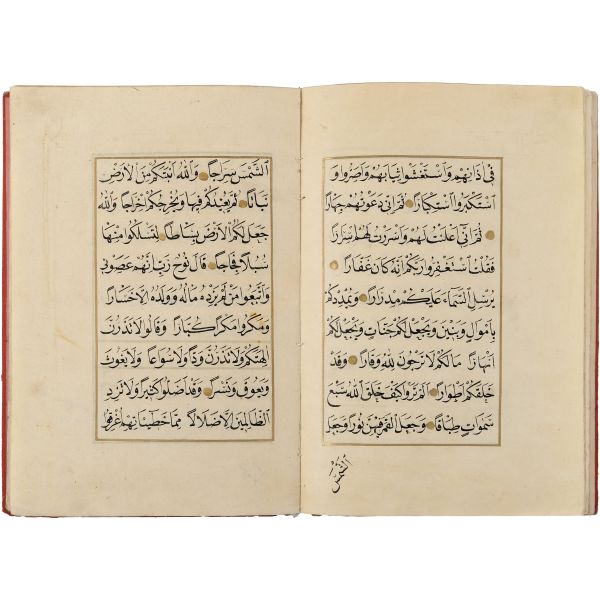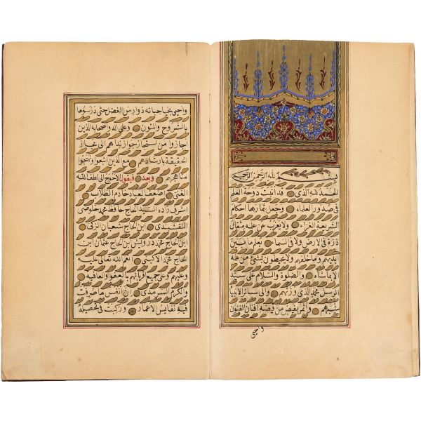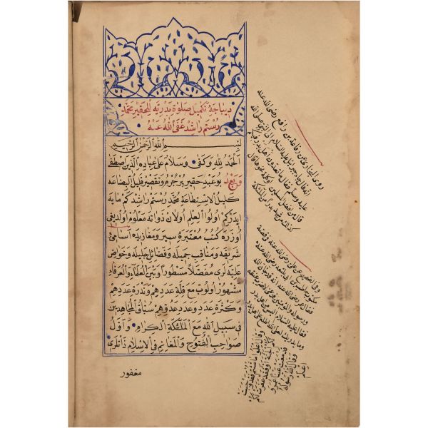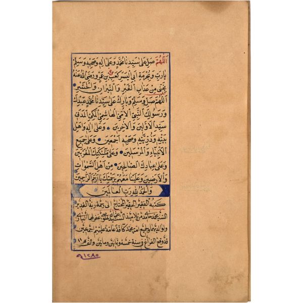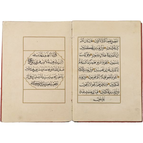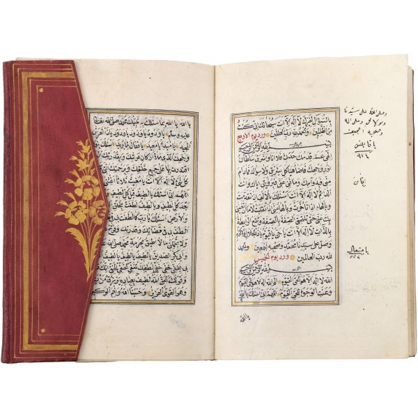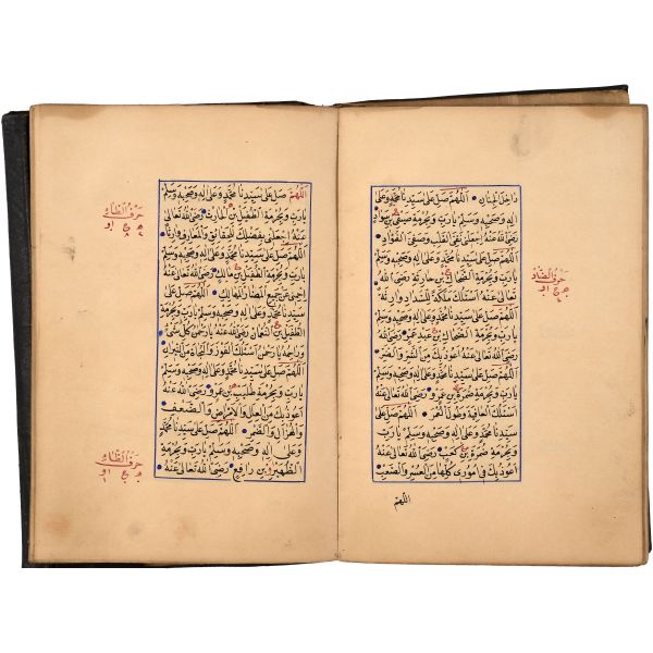 Mıklebli, şemseli ve zencerekli döre dönem cildinde. Lacivert cetvelli, kırmızı ve siyah mürekkeple harekeli nesih yazı ile...