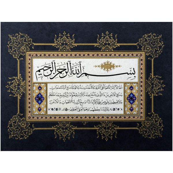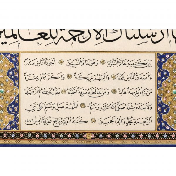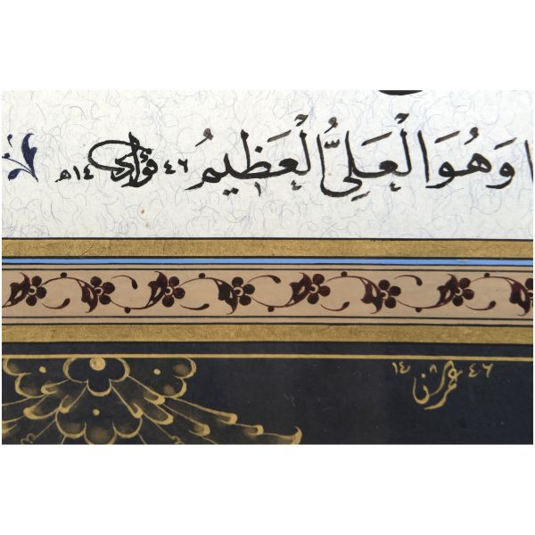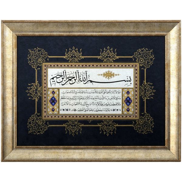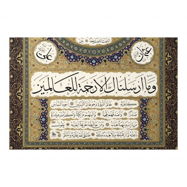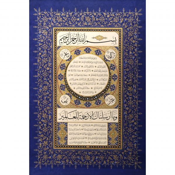Resmin sağ üstünde Âl-i İmrân sûresi 97. âyetinin "Gücü yetenlerin Beyt´i haccetmesi, Allah´ın insanlar üzerinde bir hakkıdır." mealindeki bölümü, sol üstünde de İsrâ sûresinin ilk âyetinin "Kulunu Mescid-i Haram´dan, çevresini mübarek kıldığımız Mescid-i Aksa´ya yürüten Allah, noksan sıfatlardan uzaktır." mealindeki baş kısmı yazılıdır.
