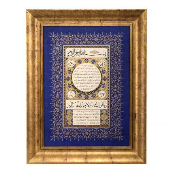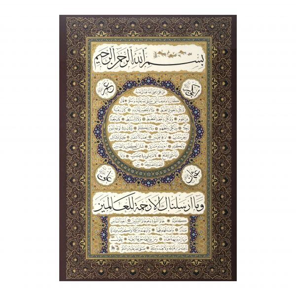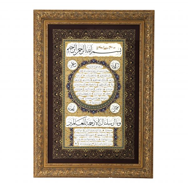 İki yüzünde de ortada lafza-i celâl, dört kenarında da "İnnehû le-kur´ânün mübîn, fî kitâbin meknûn." (Vâkıâ sûresi 77-78. âyet) ve "Ve le zikrullâhi ekber" (Ankebût sûresi 45. âyet) yazılıdır.