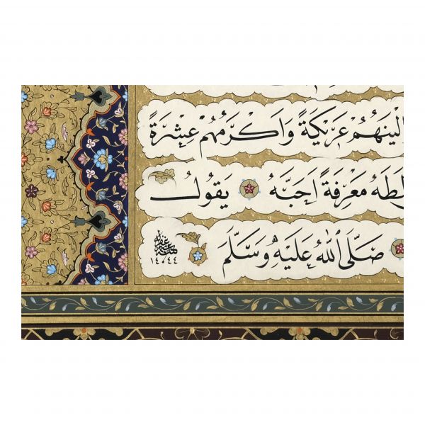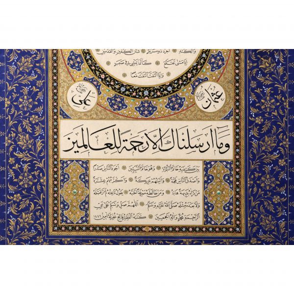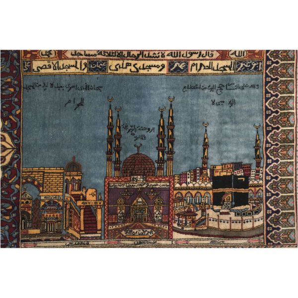 Kabe-i Muazzama, Ravza-i Mutahhara ve Kudüs´ten minber görüntüsünün işlendiği halı. Üst kısımda Arapça olarak "Üç mescitten başkası için yolculuk edilmez: Mescid-i Haram, benim Mescid´im ve Mescid-i Aksâ" hadisi yazılıdır. Hadisin sağ ve solunda lafza-i celâl ile ism-i nebî ile hulefâ-i râşidînin adları yazılıdır.