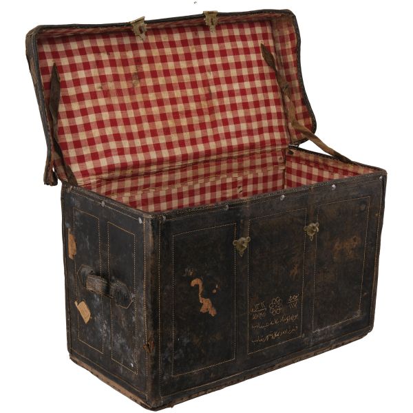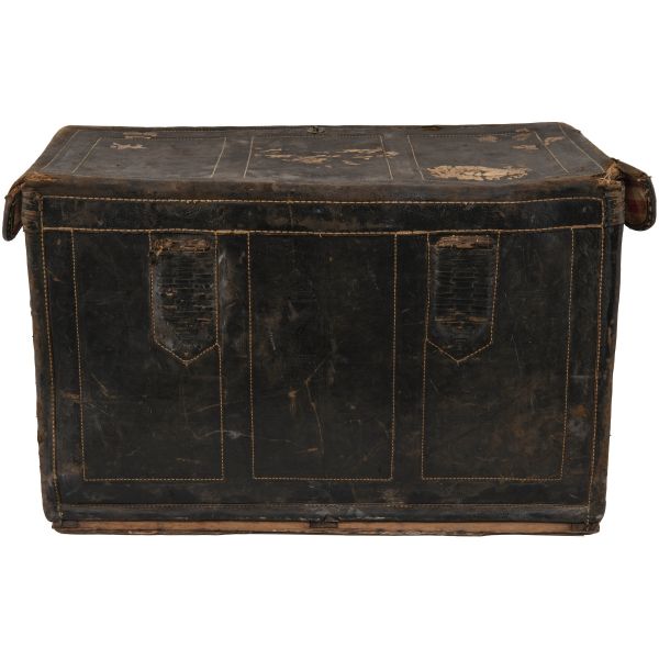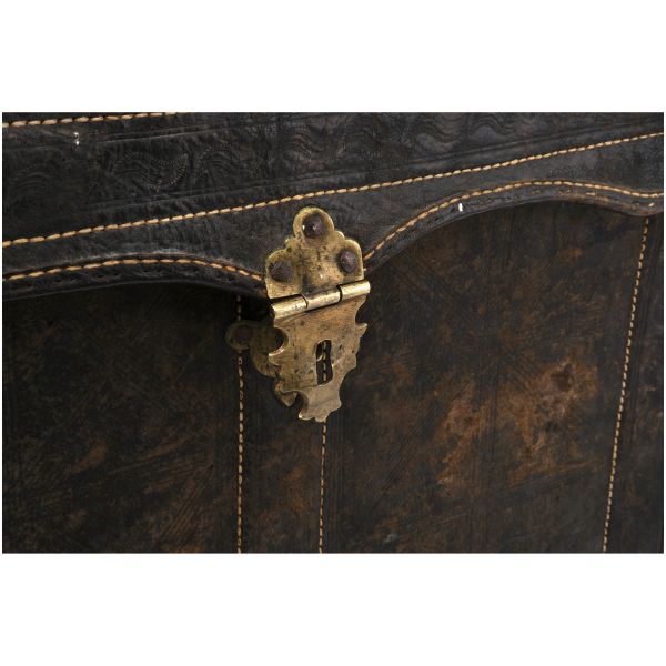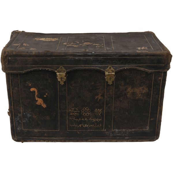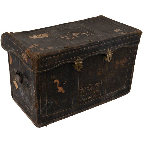 Yanları kulplu, kapağı kemer tokalı, yüzeyi sicim ve işlemeyle süslenmiş surre sandığı.