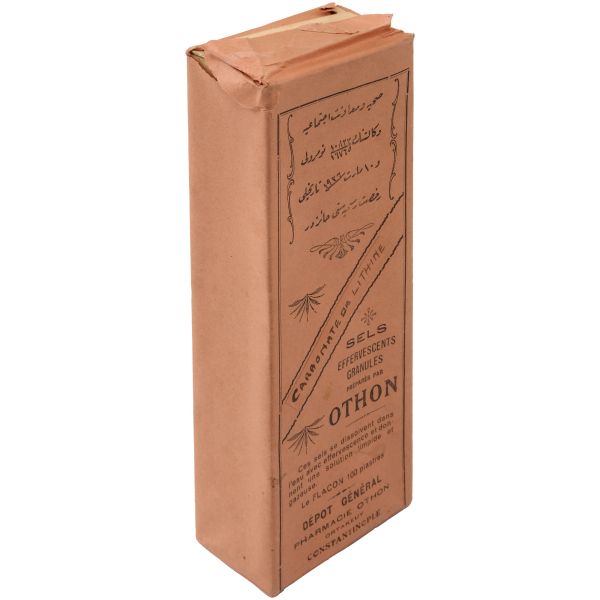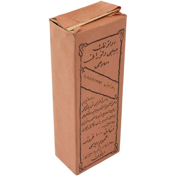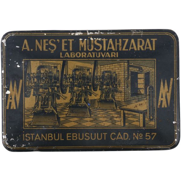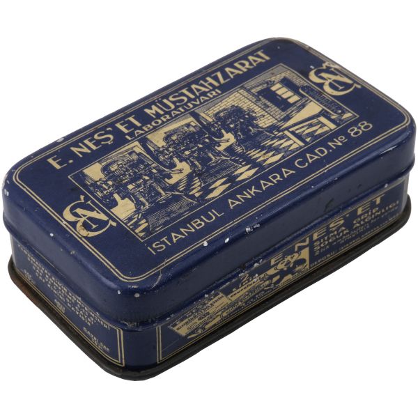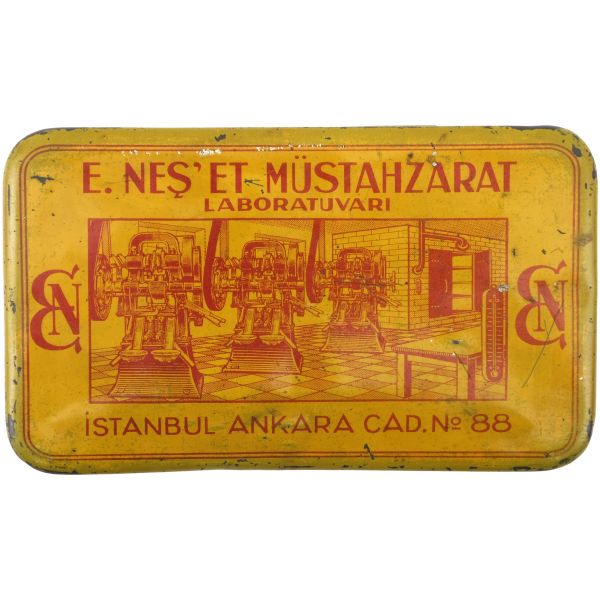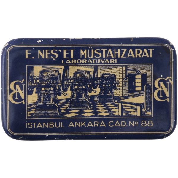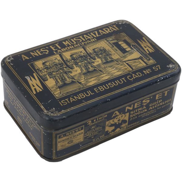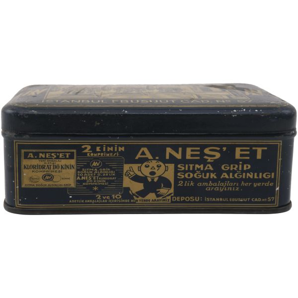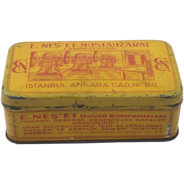 "E. Neş´et Kinin Komprimeleri: Asrımızın bütün fenni vesaitini haiz ve en son sistem makinalarımızla imâl edilen komprimelerimiz Avrupa mâmulatı fevkindedir. Bilhassa midede çabuk erimek hassası ve mıktarı tamam ve saf olması dolayısile şayanı tercihtir." Kutulardan üçü, "İstanbul Ankara Cad. No 88"; ikisi "İstanbul Ebusuut Cad. No 57" adreslidir. En büyük kutu 17,5x12x8,5 cm, en küçük kutu ise 9x5x3 cm boyutundadır.