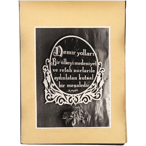 Albümde yer alan ilk iki fotoğrafta, Mustafa Kemal Atatürk ile İsmet İnönü´nün, demiryollarına dair iki vecizesinin yer aldığı panoların fotoğrafları yer almaktadır: 1) "Demir yolları bir ülkeyi medeniyet ve refah nurlarile aydınlatan kutsal bir meşaledir. - K. Atatürk" 2) "Şimendifer zaferi Türk işçisinin, Türk mühendisinin, Türk sermayesinin zaferidir. - İ. İnönü" Diğer fotoğraflarda ise özenle hazırlanmış sergi pavyonunun, detaylı dış ve iç fotoğrafları yer almaktadır.