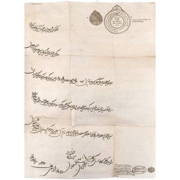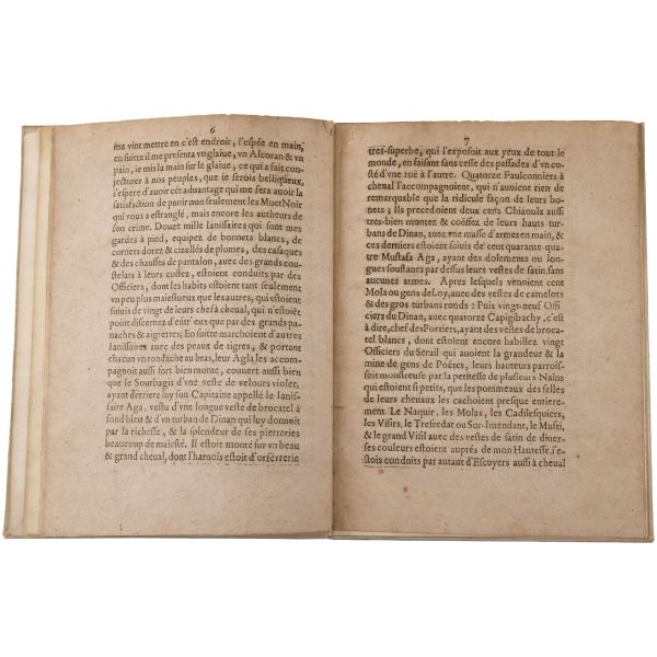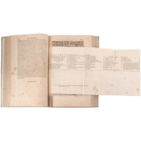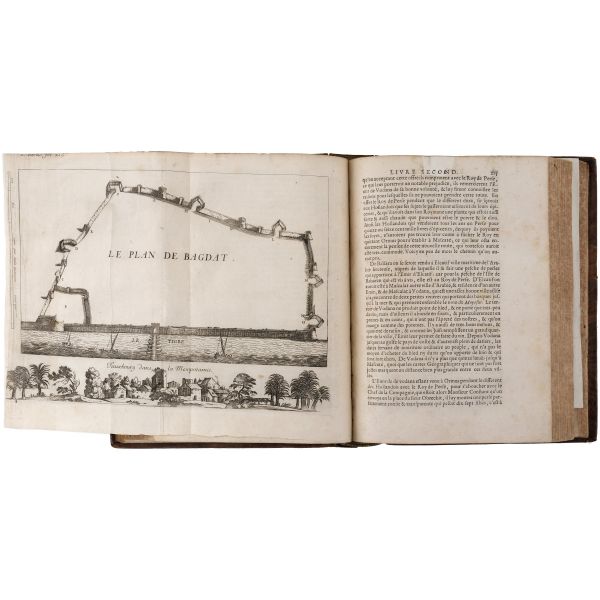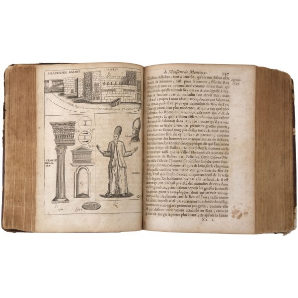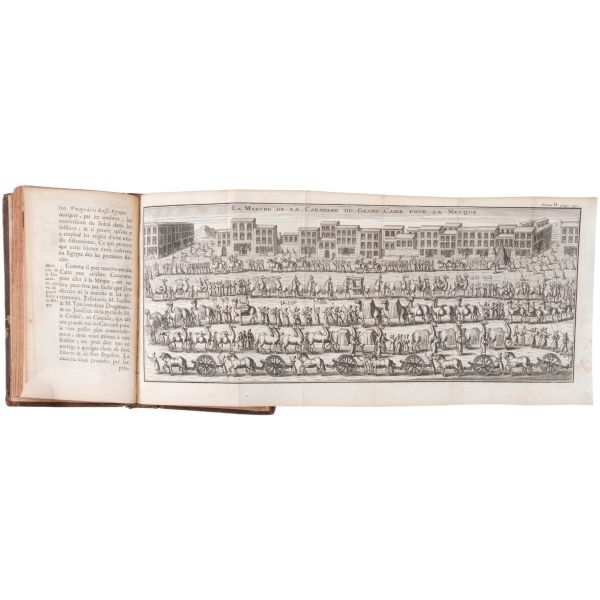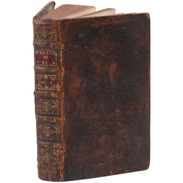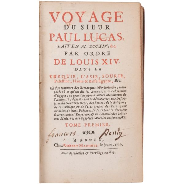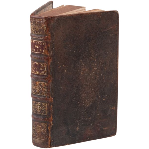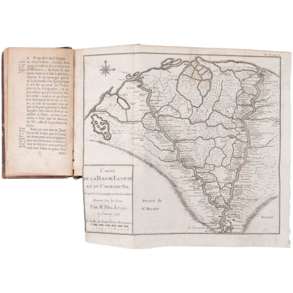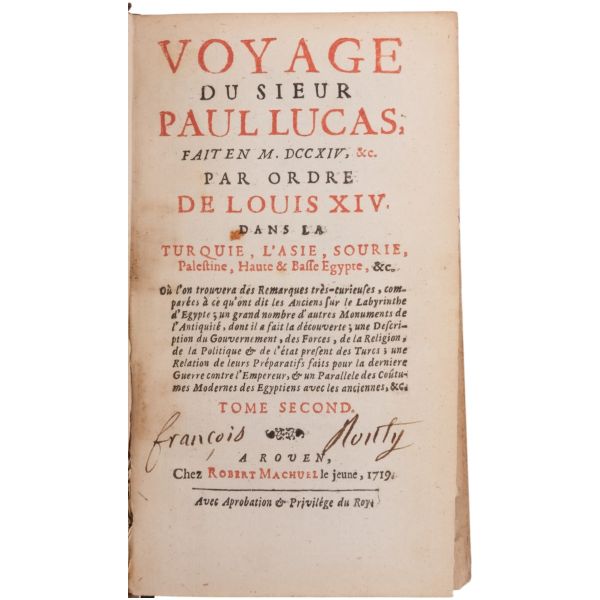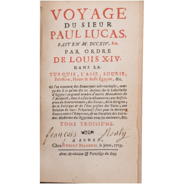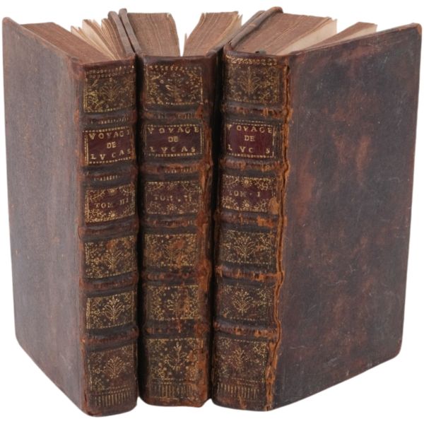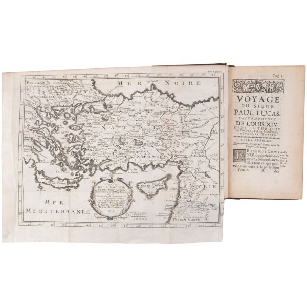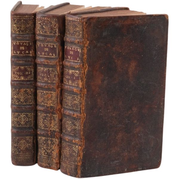 1699-1703, 1704-1708 ve 1714-1717 tarihleri arasında Doğu Akdeniz bölgesine 3 gezi düzenleyen Paul Lucas, Fransa Kralı XIV. Louis´in arkeolojik eser tedarikçisiydi. Ayak bastığı topraklardan çok sayıda arkeolojik eser, yazma, yazıt ve sikkeyle dönen Paul Lucas, gezi güzergahında yer alan Mısır, Kıbrıs, Suriye, İran, Yunanistan, Ege adaları, Anadolu ve Kutsal Topraklar´daki gözlemlerini aktardığı seyahatnameleriyle Levant ve çevresine dair çok önemli bilgilerin günümüze ulaşmasını sağlamıştır. Lucas´ın müzayedemizde sunduğumuz seyahatnamesi, 7 gravür ve 4 katlanır levha içermektedir. Sırtları panelli, altın yaldız dekor ve başlıklı, iç kapakları ebru desenli deri ciltlerinde. 1. Cilt: 1 katlanır harita, 6 katlanır levha, 3 tam sayfa gravür. 2. Cilt: 1 katlanır harita, 12 katlanır levha, 5 tam sayfa gravür. 3. Cilt: 3 katlanır levha, 3 tam sayfa gravür.