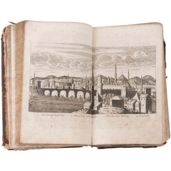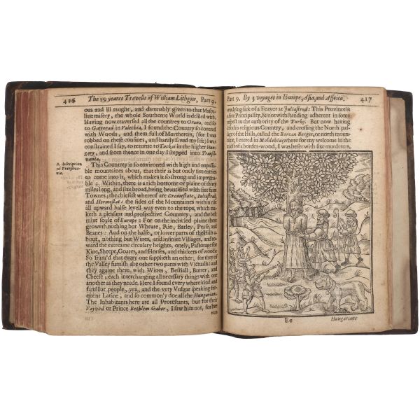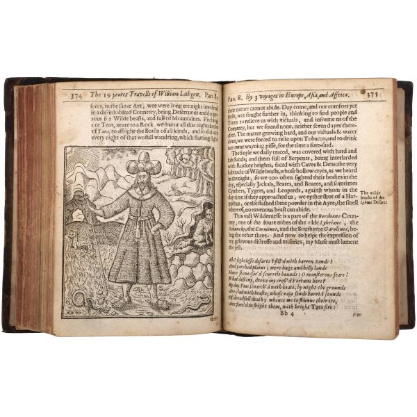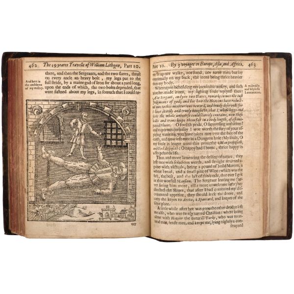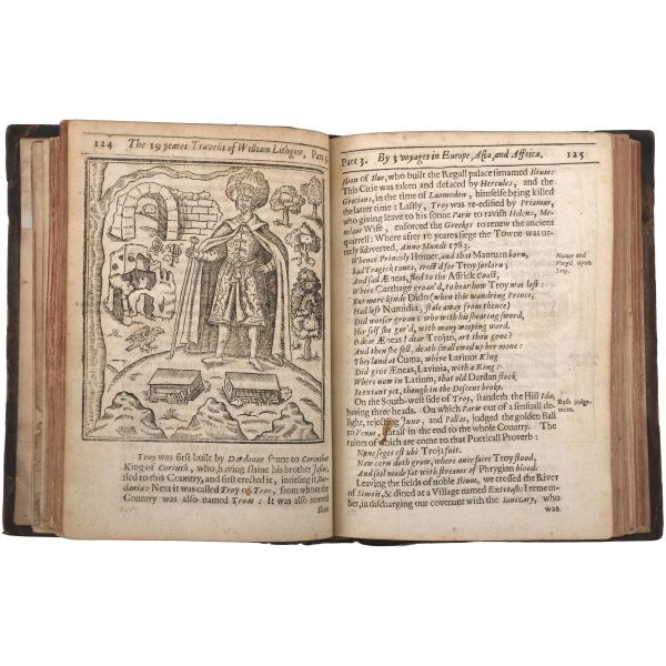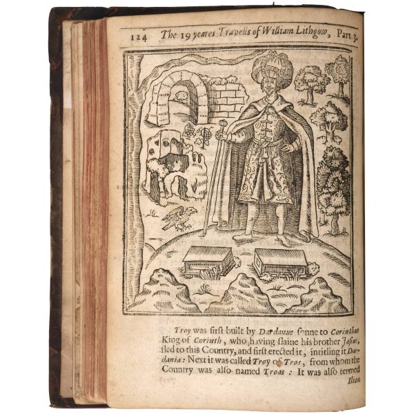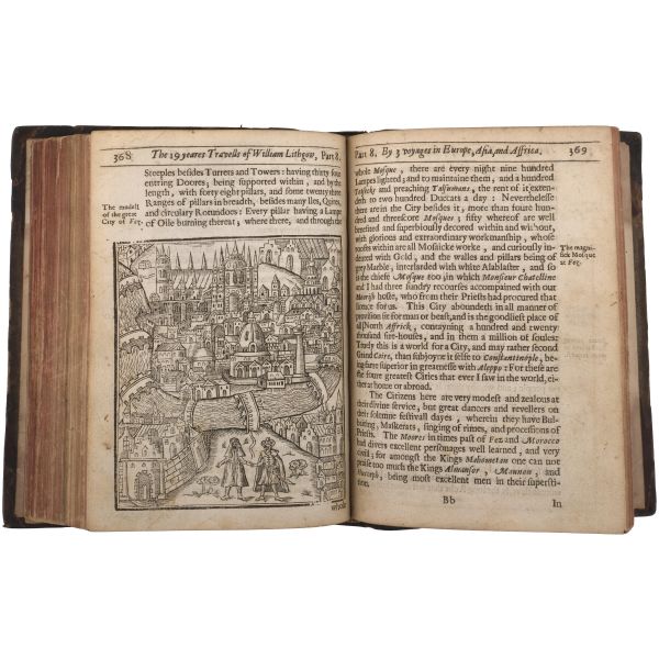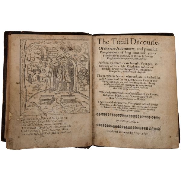 İskoç gezgin William Lithgow´un (1582-1645), 19 yıl boyunca Avrupa, Asya ve Afrika´da "yürüyerek" 36.000 mil katettiğini iddia ettiği seyahatlerini, ahşap oyma baskı gravürler eşliğinde okurlara sunduğu kitabı... "The Societ of Writters to the Signet" kabartma logolu, deri sırtlı cildinde. Sayfa kenarları kırmızı boyalıdır.