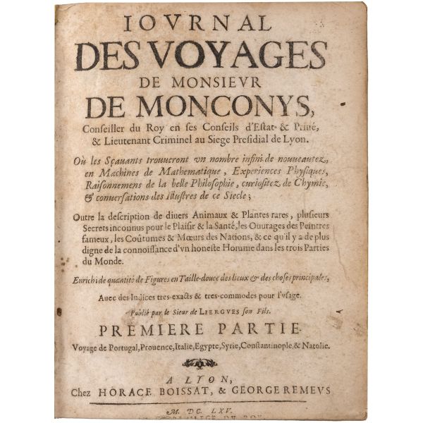 Metafizik ve mistisizme büyük ilgi duyan Fransız fizikçi ve yargıç Balthasar de Monconys´nin, Yunan ve Arap simyacıların öğretilerinin kaynaklarını keşfetmek ve bilim adamlarıyla bilgi alışverişi yapmak amacıyla Küçük Asya ve Kutsal Topraklar´a, Portekiz´e, İspanya´ya, İtalya´ya, İngiltere´ye, Hollanda´ya ve Almanya´ya yaptığı yolculuklarda tuttuğu güncelerin, ölümü sonrası oğlu tarafından derlenip yayımlanmış hali... Sırtı altın yaldız dekorlu, tümüyle deri dönem cildinde. *Cildinde bölgesel yıpranmalar ve genel yorgunluk mevcuttur.