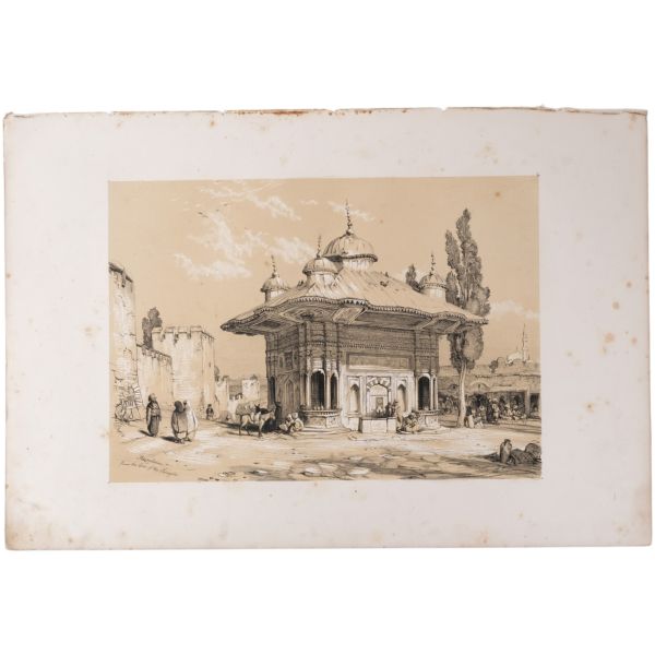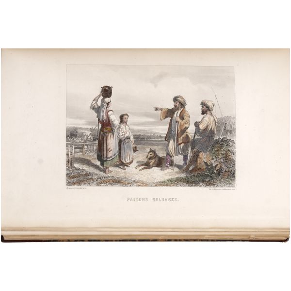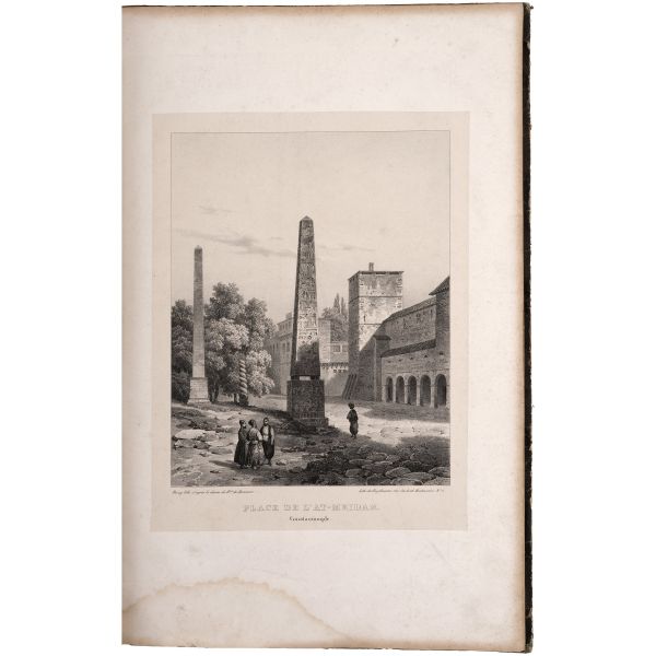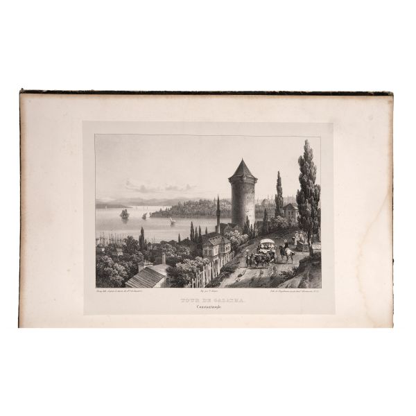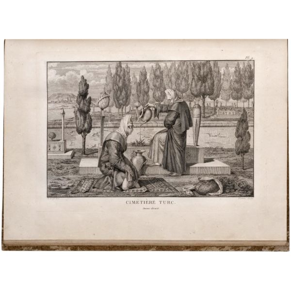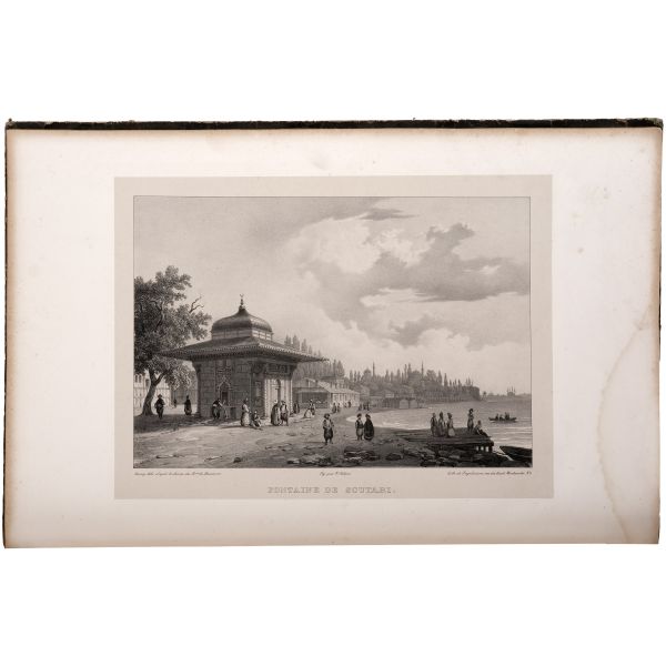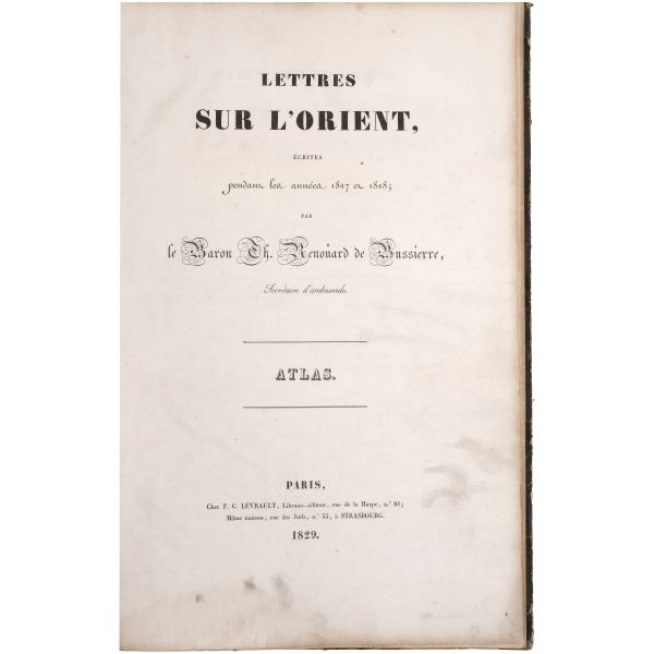 Fransız diplomat ve gezgin Marie-Théodore de Bussierre´in, bir süre ikamet ettiği İstanbul´dan Mısır´a uzanan seyahatnamesinin 32 gravür içeren atlası. Gravürlerde İstanbul, Bursa, Midilli, Bozcada ve Mısır manzaraları görülmektedir. Kapakları ve iç kapakları ebrulu dönem cildinde. *Cildinde yıpranmalar mevcuttur. Atabey: 177, Blackmer: 1410...