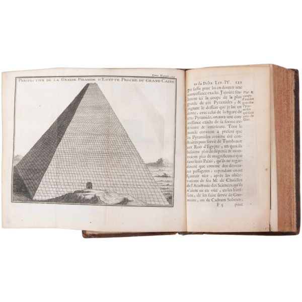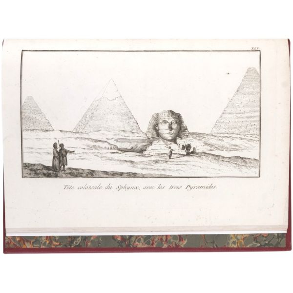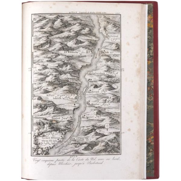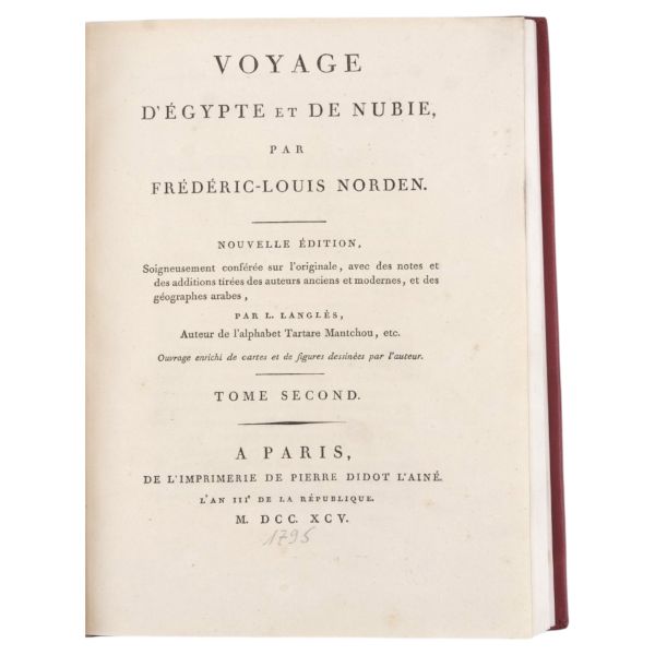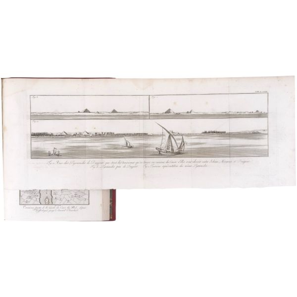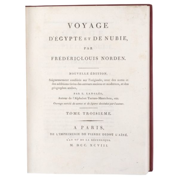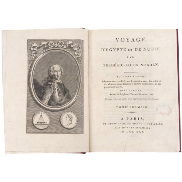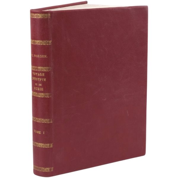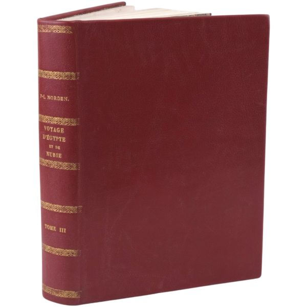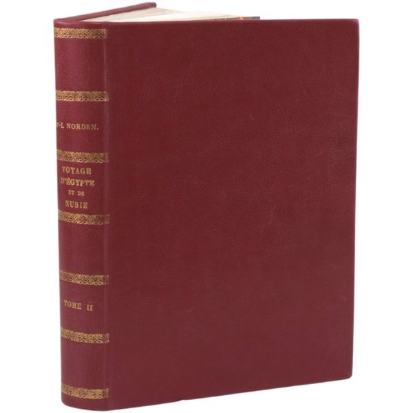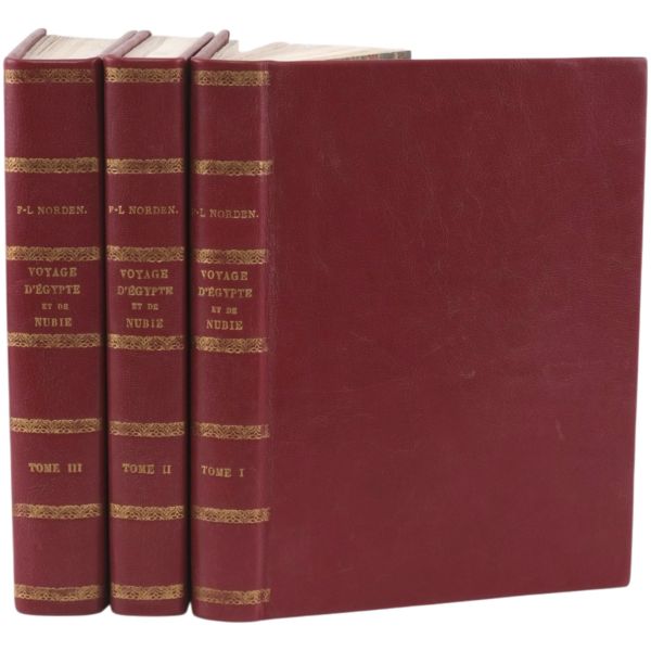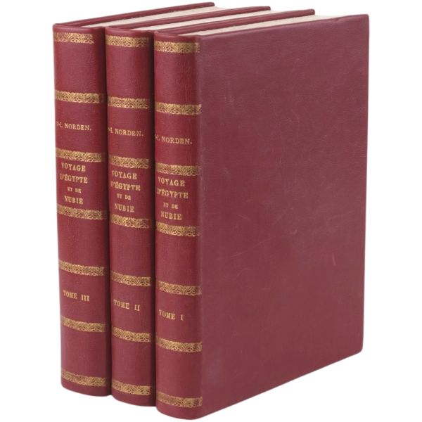 Danimarkalı denizci, haritacı ve arkeoloji araştırmacısı Frederic Louis Norden´in, oldukça geniş kapsamlı ve çok zengin görsellerle süslü, 1737-1738 tarihli Mısır yolculuğu… V. Frederik’in emriyle Danimarka Kraliyet Bilimler ve Edebiyat Akademisi tarafından yayımlanan ve Mısır anıtlarının ilk gerçekçi çizimlerinin yer aldığı bu çok değerli seyahatname, bugün bile 19. ve 20. yüzyılda yapılan kazılarından önceki Mısır anıtlarının görünümü için birincil kaynak olmaya devam etmektedir. Sırtları altın yaldız dekor ve başlıklı, yeni yapım deri ciltlerinde. İç kapakları ebru desenlidir.