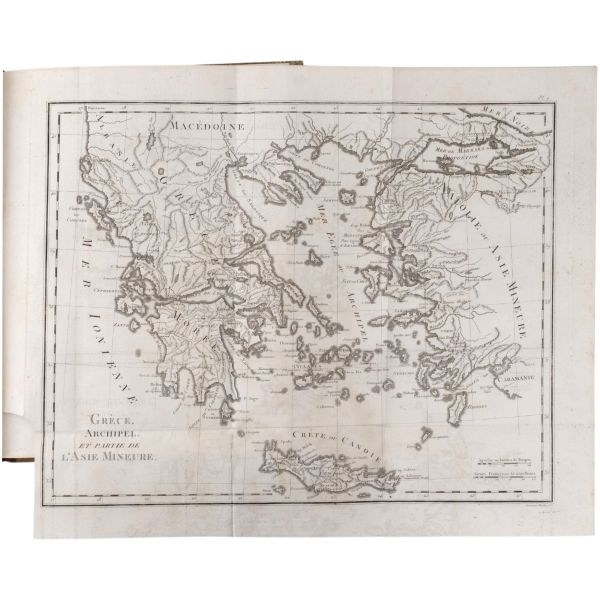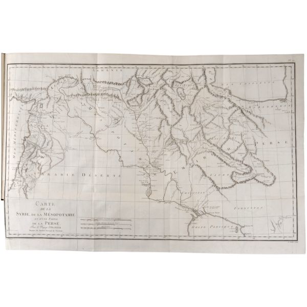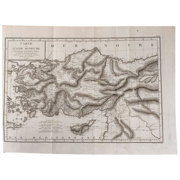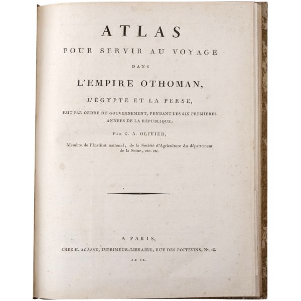 Fransız böcek ve doğa bilimci Guillaume-Antoine Olivier (1756-1814), 1792 yılında bir başka doğa bilimci Bruguiere ile birlikte Küçük Asya, İran, Mısır, Kıbrıs ve Korfu´yu kapsayan ve tamamlanması 6 yıl süren bir bilimsel yolculuğa çıkmıştır. Bu yolculukta birçok coğrafi ve jeolojik gözlemde bulunan ve botanik ve zoolojik zengin bir koleksiyon toplayan Olivier, Fransa´ya döndükten sonra seyahat gözlemlerini meraklı okurlarla paylaşmıştır. Müzayedemize sunduğumuz bu atlas, 9 katlanır levha ve 41 gravür içermektedir.