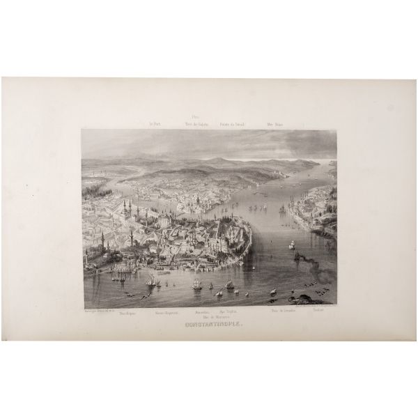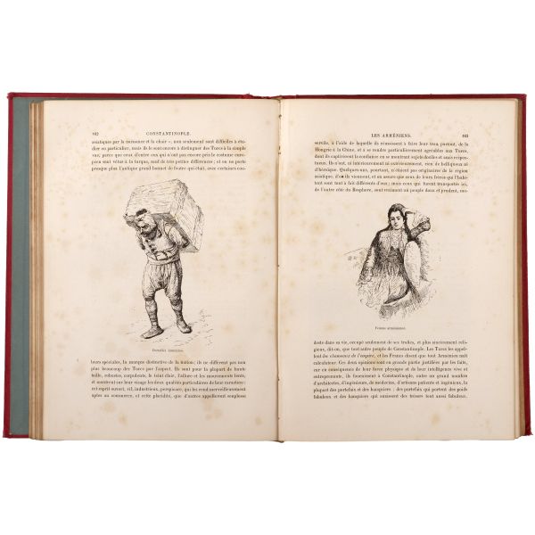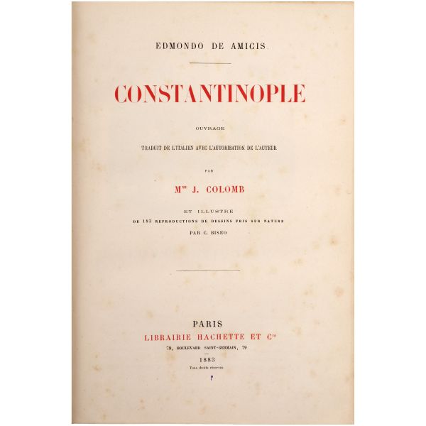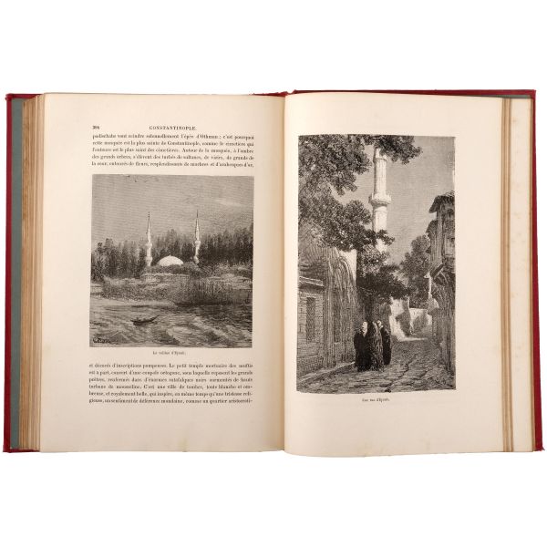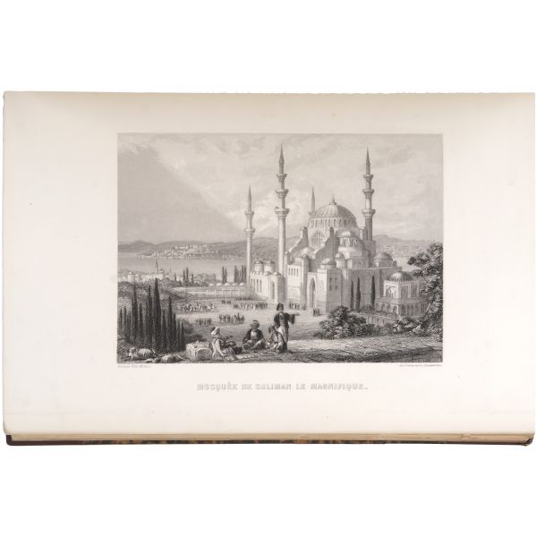 İstanbul konulu seyahatnameler arasında önemli bir yer tutan, canlı ve renkli üslubuyla geçen asrın İstanbul’u için zengin bilgiler veren, birçok dile çevrilen ve defalarca basılan kitabın 1883 tarihli Fransızca baskısı... Altın yaldız detaylı, gofre tezyinatlı dekoratif dönem cildinde. Sayfa kenarları altın yaldızlıdır. *Sırtında açılma meydana gelmiştir.