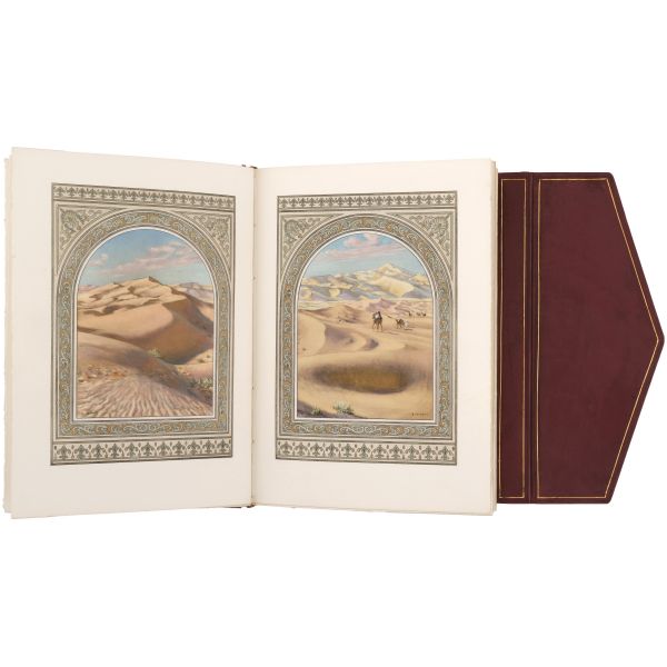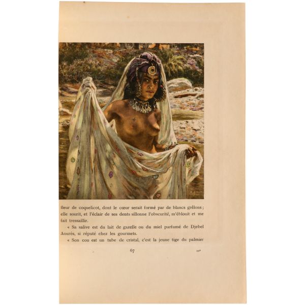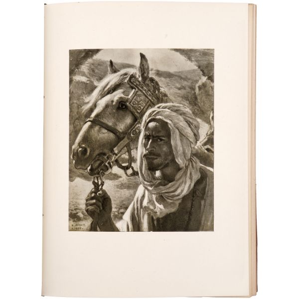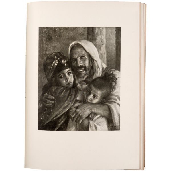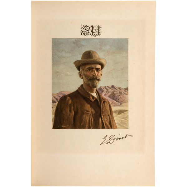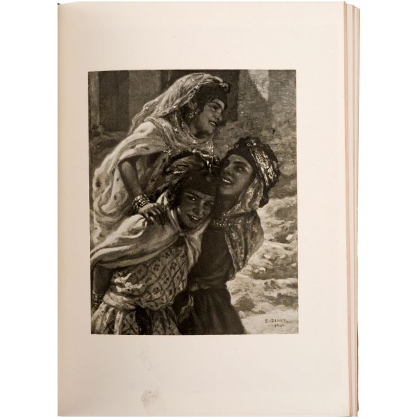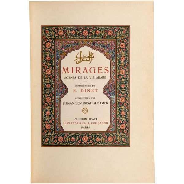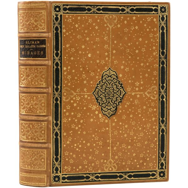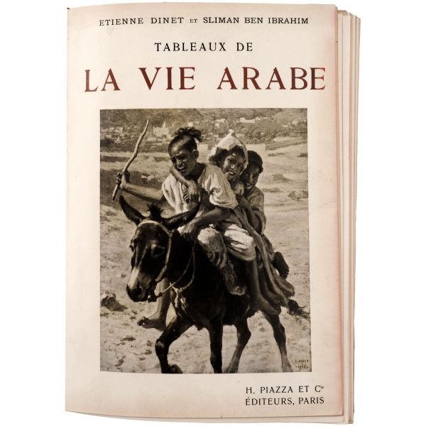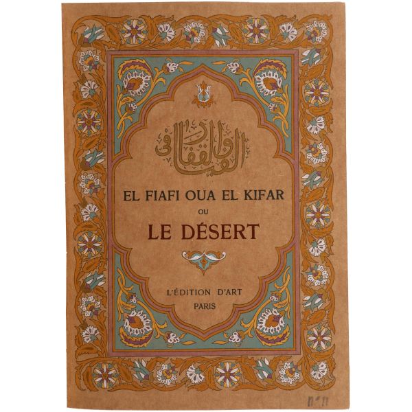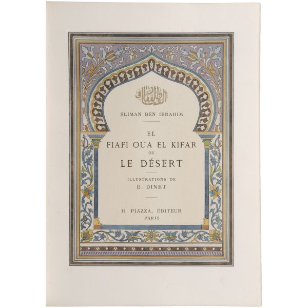 İslamiyet’i kabul ettikten sonra “Nasreddine” ismini alan ve Arap edebiyatının Fransızcaya çevrilmesinde aktif rol alan Fransız oryantalist ressam Alphonse Etienne Dinet´in büyüleyici renkli resimleri ve kendisinde din konusunda rehberlik eden yakın dostu Sliman ben Ibrahim Baamer´in metinleriyle "Arap yaşamından sahneler"... 375 kopyası (76-450) Blanchet & Kleber fabrikalarında üretilen el yapımı parşömen kâğıdına basılan eserin 267 numaralı nüshası... Şemse dekorlu ve mıklepli, tümüyle deri, kutulu koleksiyoner cildinde. Orijinal karton cildi muhafaza edilerek ciltlenmiştir. Sayfa kenarları altın yaldızlıdır.