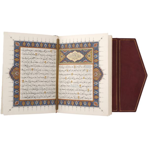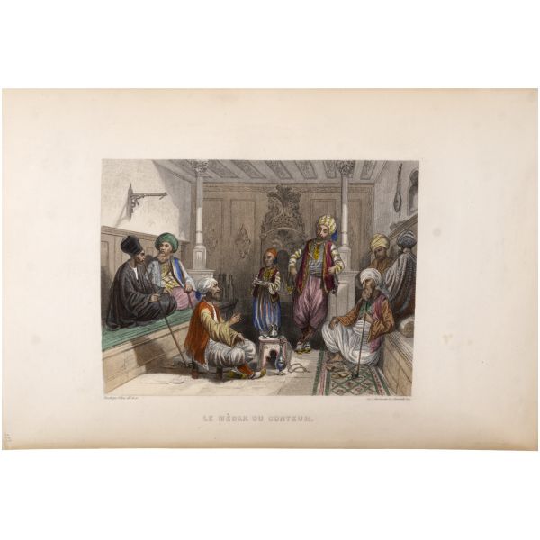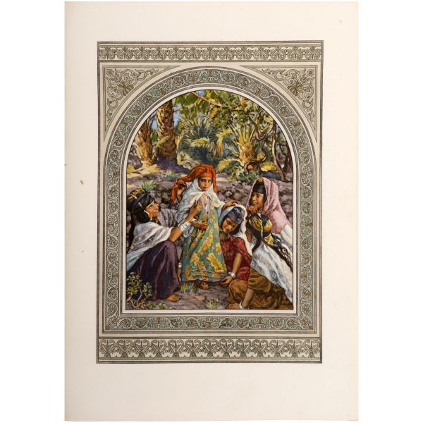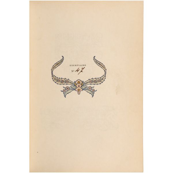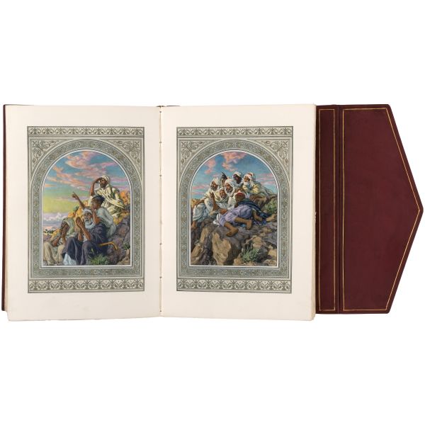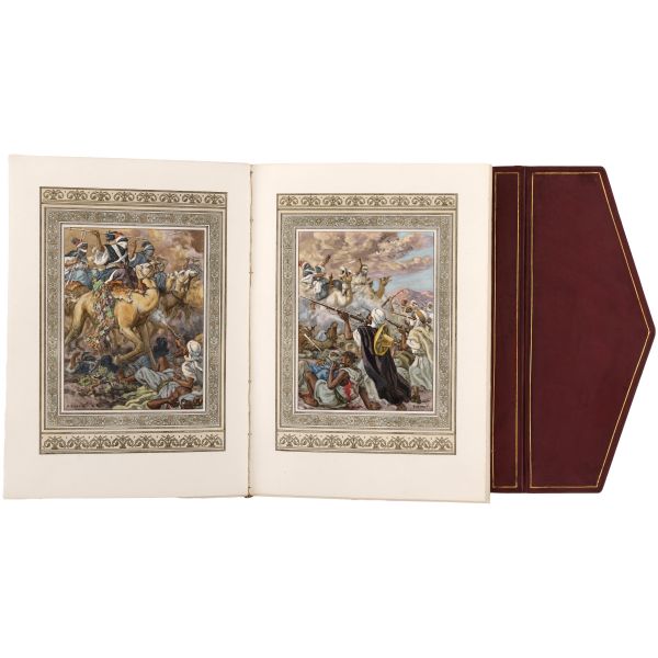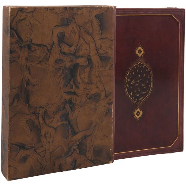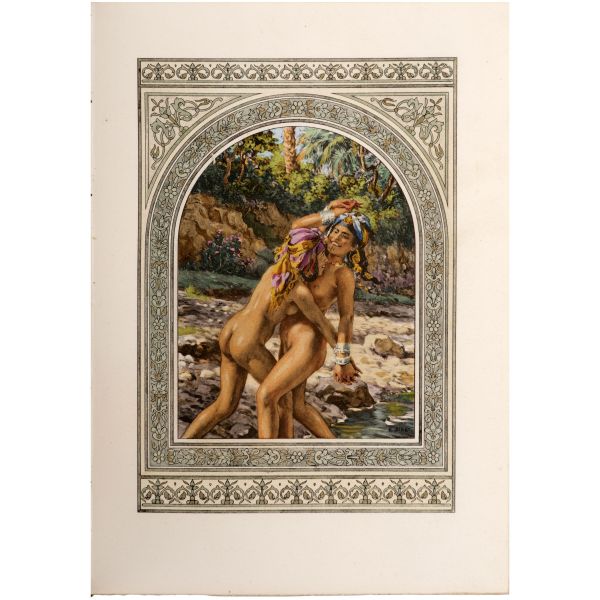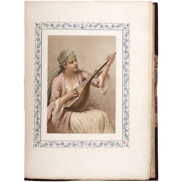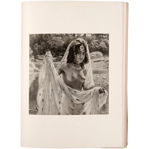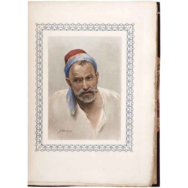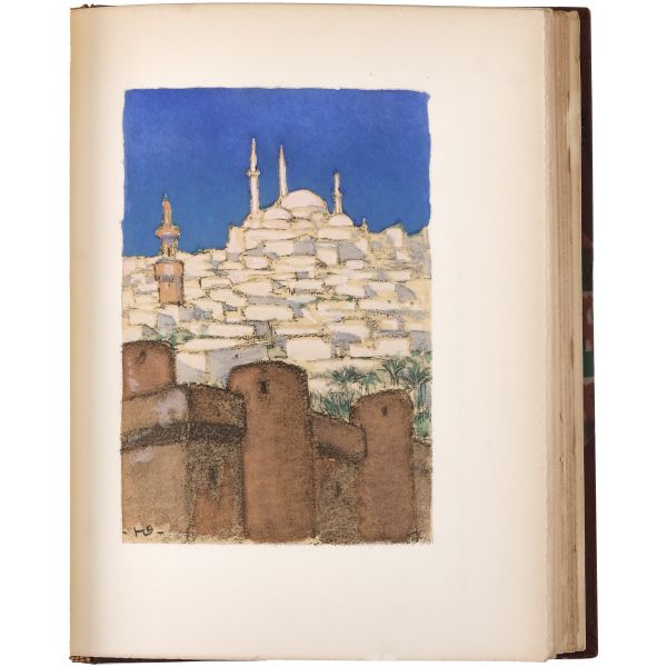 İslamiyet’i kabul ettikten sonra “Nasreddine” ismini alan ve Arap edebiyatının Fransızcaya çevrilmesinde aktif rol alan Fransız oryantalist ressam Alphonse Etienne Dinet´in büyüleyici renkli resimleri ve kendisinde din konusunda rehberlik eden yakın dostu Sliman ben Ibrahim Baamer´in metinleriyle "Arap yaşamından sahneler"... 375 kopyası (76-450) Blanchet & Kleber fabrikalarında üretilen el yapımı parşömen kâğıdına basılan eserin 267 numaralı nüshası... Şemse dekorlu ve mıklepli, tümüyle deri, kutulu koleksiyoner cildinde. Orijinal karton cildi muhafaza edilerek ciltlenmiştir. Sayfa kenarları altın yaldızlıdır.