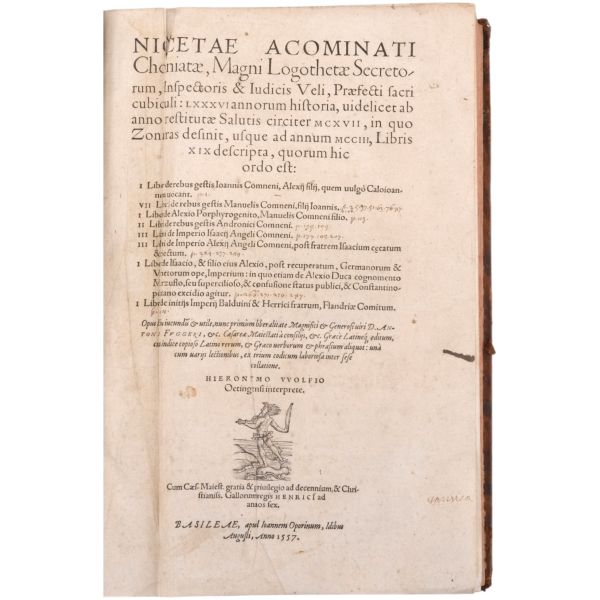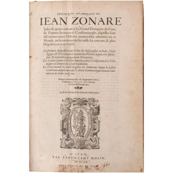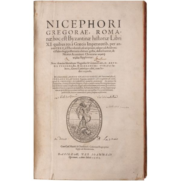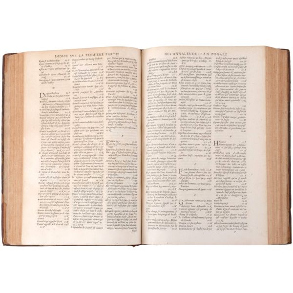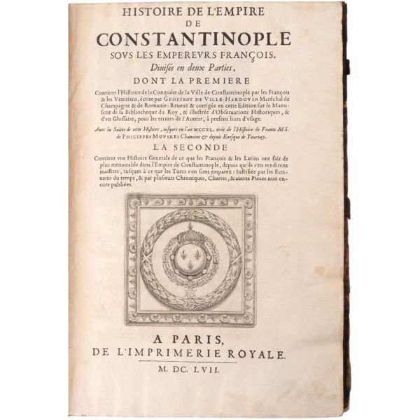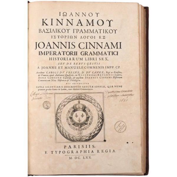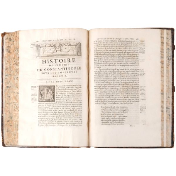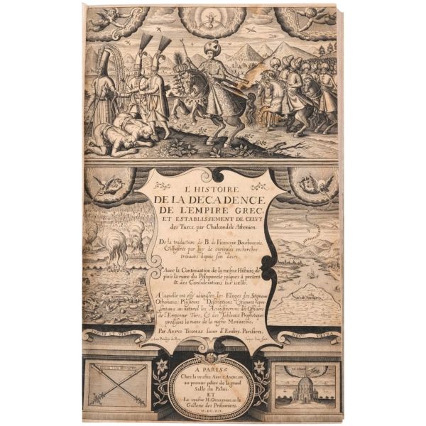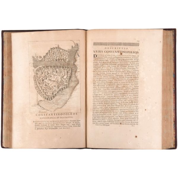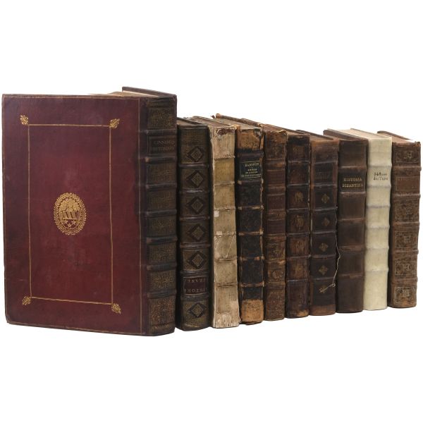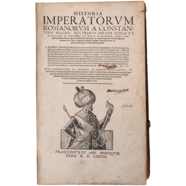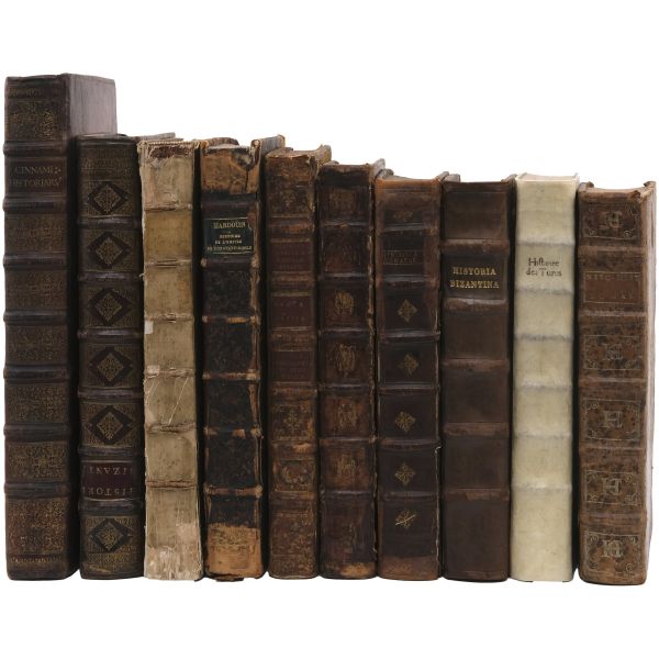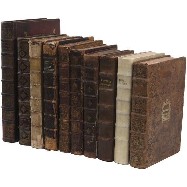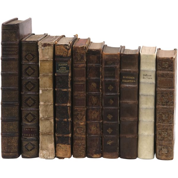 Lot içeriği: 1) Dördüncü Haçlı Seferi ve sonuçları: HISTOIRE DE L´EMPIRE DE CONSTANTINOPLE SOUS LES EMPEREURS FRANÇOIS, Geoffroy de Villehardouin, 1657, Imprimeur du Roy & de la Reyne, Paris, 370+331+86 sayfa, 27x39 cm... Geoffroy de Villehardouin (Villehardouin’li Geoffrey), Kutsal Topraklar´a gitmek üzere yola çıkan Haçlı ordularının, amaçlarından saparak Bizans’ın başkenti Konstantinopolis’i ansızın işgaliyle neticelenen Dördüncü Haçlı Seferi´ne katılan Fransız şövalye ve tarihçidir. Kaleme aldığı "De la Conquête de Constantinople" (Konstantinopolis´in Fethi Üzerine) adlı eseri, Dördüncü Haçlı Seferi’nin en mühim tarihi kaynağıdır. Geoffroi de Villehardouin´in bu meşhur kroniği ile başlayan kitapta, editörlüğünü üstlenen Fransız Orta Çağ ve Bizans tarihçisi Charles du Fresne´nin kendi kaleme aldığı ve çeşitli kaynaklardan derlediği makalelerle fetih sonrası Konstantinopolis mercek altına alınmıştır. Ön ve arka kapağı papaz (bishop) armalı, sırtı panelli, sayfa kenarları ebrulu, tümüyle deri dönem cildinde... *Cildinde yıpranmalar mevcuttur.) 2) Bizanslı vakanüvis Ioannis Zonaras tarafından kaleme alınan dünya tarihi (1 ciltte 3 bölüm): CHRONIQUES, OU ANNALES DE JEAN ZONARE... (traduit par J. Millet de S. Amour), 1560, Par Barthelemy Molin, A Lyon, 122+247+115 sayfa, 25x36 cm... (Ön ve arka kapağı armalı, sırtı panelli ve altın yaldız dekorlu, tümüyle deri dönem cildinde...) 3) Başta Bizans olmak üzere tüm tarihi kapsayan bir derleme: CORPUS UNIVERSAE HISTORIAE PRAESERTIM BIZANTINAE, 1567, Lutetiae, 172+77+120 sayfa, 23x35 cm... (Ioannis Zonaras, Georgios Kedrenos, Niketas Choniates, Nikiforos Grigoras ve Laonikos Halkokondilis gibi Bizanslı vakanüvis ve tarihçilerin çalışmalarından istifade edilerek hazırlanmış bir dünya tarihi derlemesi... Ön ve arka kapağı armalı ve gofre süslemeli, sırtı panelli ve altın yaldız başlıklı, tümüyle deri dönem cildinde...) 4) Niketas Choniates tarafından kaleme alınan Yunan ve Bizans tarihi (1 ciltte 2 bölüm): 1- NICETAE ACOMINATI CHONIATAE, MAGNI LOGOTHETAE SECRETORUM, INSPECTORIS & IUDICIS VELİ, PRAEFECTI SACRI CUBICULI... 2- NICEPHORI GREGORAE, ROMANAEHOC EST BYZANTINAE HISTORIAE LIBRI XI QUIBUS RES A GRAECIS IMPERATORIB..., (ed. Hieronymus Wolf), 1557, Basileae, 317+533 sayfa, 24x34 cm... (Ön ve arka kapağı "College d´Harcourt" armalı, sırtı panelli, altın yaldız dekor ve başlıklı, tümüyle deri dönem cildinde... Sayfa kenarları kırmızı boyalıdır.) 5) Niketas Choniates tarafından kaleme alınan Yunan ve Bizans tarihi: NICEPHORI GREGORAE, ROMANAEHOC EST BYZANTINAE HISTORIAE LIBRI XI QUIBUS RES A GRAECIS IMPERATORIB... (ed. Hieronymus Wolf), 1562, Basileae, 533 sayfa, 24x38 cm... (Süet deri kaplı ön ve arka kapağı armalı, deri sırtı panelli, altın yaldız dekor ve başlıklı dönem cildinde... Sayfa kenarları kırmızı boyalıdır.) 6) Bizans´ın kurucusu Büyük Konstantin´den Bizans´ın son İmparatoru Konstantin´e Roma imparatorlarının tarihi (1 ciltte 3 bölüm): HISTORIA IMPERATORUM ROMANORUM A CONSTANTINO MAGNO, QUI PRIMUS IMPERII SEDEM ET DIGNITATEM EX VRBE ROMA AC ITALIA IN ORIENTEM, ATQUE CONSTANTINOPOLIM TRANSTULIT, VSQUE AD CONSTANTINUM POSTREMUM..., 1578, Francofurti ad Moenum, 181+127+77 sayfa, 22x35 cm... (Ön ve arka kapağı armalı, sırtı panelli, altın yaldız dekor ve başlıklı, tümüyle deri dönem cildinde...) 7) Laonikos Halkokondilis´in kaleminden Yunan (Bizans) İmparatorluğu´nun çöküşü ve Türklerin yükselişi: L´HISTOIRE DE LA DECADENCE DE L´EMPIRE GREC, ET ESTABLISSEMENT DE CELUY DES TURCS, PAR CHALCONDILE ATHENIEN... Laonikos Chalkokondyles, (ed. Thomas Artus, Sieur d´Embry), 1612, Abel l´Angelier, Paris, 531+95+114 sayfa, 23x35 cm... (İçinde padişah portreleri, sivil ve askeri Türk kostümleri ve çeşitli planlar olmak üzere toplam 93 gravür, bir adet de katlanır İstanbul panoraması mevcuttur... Sırtı panelli vellum cildinde...) 8) Bizans imparatoru I. Manuil´in sekreterliğini yapan Bizanslı tarihçi Ioannis Kinnamos tarafından kaleme alınan ve 1118 - 1176 yıllarını kapsayan Bizans tarihi: JOANNIS CINNAMI IMPERATORII GRAMMATICI HISTORIARUM LIBRI SEX (Yunanca ve Latince), 1670, E Typographia Regia, Paris, 602 sayfa, 30x45 cm... (Ön ve arka kapağı armalı, sırtı panelli, altın yaldız dekor ve başlıklı, tümüyle deri dönem cildinde... İç kapakları ve sayfa kenarları ebru süslemelidir.) 9) Fransız asıllı Orta Çağ ve Bizans tarihçisi Charles du Fresne, sieur du Cange´den, çok sayıda sikke görseli, gravür ve katlanır levha eşliğinde Bizans Tarihi: HISTORIA BYZANTINA: I FAMILIAE BYZANTINAE - II CONSTANTINOPOLIS CHRISTIANA, Charles du Fresne, sieur du Cange, 1680, Lutetiae Parisiorum, Apud Ludovicum Billaine, Bibliopolam Parisiensem, 372+180+203 sayfa, 26x39 cm... (Ayasofya levhaları eksiksizdir... Sırtı altın yaldız dekor ve başlıklı, tümüyle deri dönem cildinde... Sayfa kenarları altın yaldızlıdır.) 10) Fransız asıllı Orta Çağ ve Bizans tarihçisi Charles du Fresne, sieur du Cange´den, çok sayıda sikke görseli, gravür ve katlanır levha eşliğinde Bizans Tarihi: HISTORIA BYZANTINA: I FAMILIAE BYZANTINAE - II CONSTANTINOPOLIS CHRISTIANA (ikinci baskı), Charles du Fresne, sieur du Cange, 1729, Ex Typographia Bartholomaei Javarina, Venetiis, 242+139+136+22 sayfa, 27x39 cm... (Sırtı panelli vellum cildinde...)