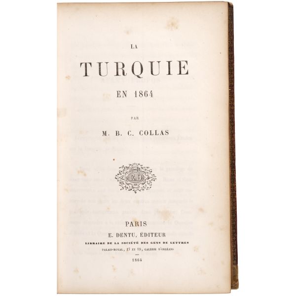 Fransız politikacı Bernard-Camille Collas tarafından kaleme alınan eser; Tanzimat sonrası Osmanlı İmparatorluğu´nun geniş bir panoramasını sunarken, geçmişi ele almayı da ihmal etmeyen nitelikli bir çalışmanın meyvesidir. Ön kapağı Sultan Abdülaziz tuğralı, altın yaldız dekorlarla bezeli dekoratif cildinde. Sayfa kenarları altın yaldızlıdır.